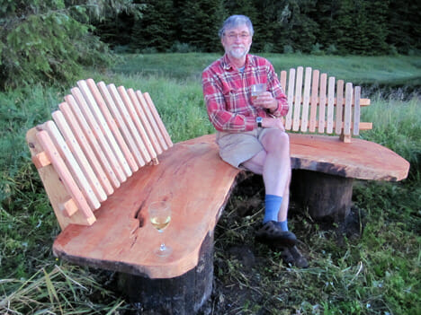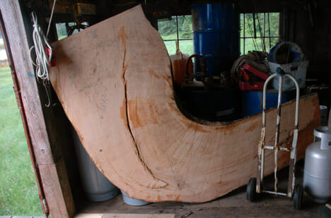 Usually, you select a piece of wood from the woods that looks like this–a huge natural knee, but this is too big so, in my spare time, I make a wooden bench out of it instead: