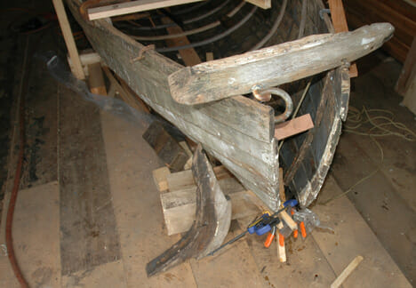 Some people like taking in stray dogs and cats….me, I like old wooden boats…..lots of rot but classic lines are a must. Here is the dory off the St. Lazaria which had been sitting on the dock upside down for about five years. Her gunwhales have flattened out on the dock so she’s lost all her shape and looks like a canoe. All the ribs are broken at both the keel and chines so there is a lot of work ahead.