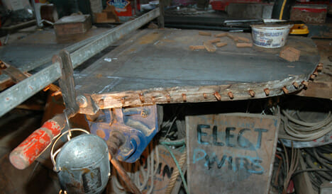 Here I’m placing the pre-bent rib into the stern section carefully. Sometimes these ribs break–a real bummer because I then start all over bending a new frame. Worse is when you’ve fastened each frame to each plank and the last bend breaks…..then it’s time to get out the grinders and chisels and remove everything. (The next post will explain the copper fasteners.)