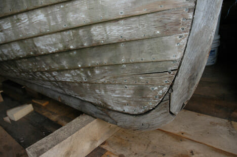 The ‘forefoot’ (bent section) was completely fractured which left the stem and keel separated–and this is a hard piece to replace. First you have to relieve all the planks where they land on the stem, remove the stem and then remove all the fasteners that tie the forefoot to the keel and ‘garboard’ plank (the one fastened to the keel).