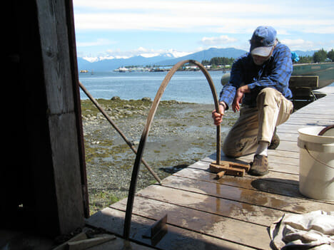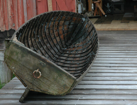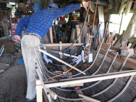 One rib at a time–I pre-bend each white oak rib by springing it on our dock to shape it for the next day’s installation