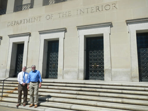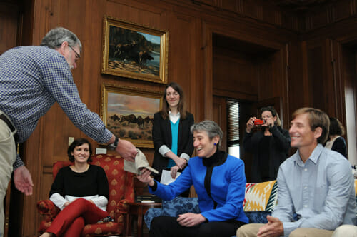I requested a meeting with the Secretary of the Interior, Sally Jewell, and we spend our allotted 15 minutes in her office.  Here, she receives a “Ranger of the Lost Art” hat with “I Ride With Ranger Doug” on the back band.  She is elated!  We compare our Co-op numbers and then launch into Alaska politics, geology, and of course, this unique poster art.