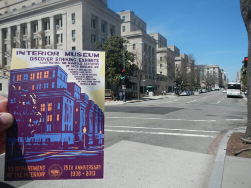 Here is a postcard version of the poster print for the 75th anniversary of the DOI building which coincides with the Museum opening after four and one half years of closure due to Congressional sequestration.   The entire DOI building was built in the WPA era in only one and a half years.  It took Congress one year to approve the lighting just for this exhibit !   Let’s go for a tour…..
