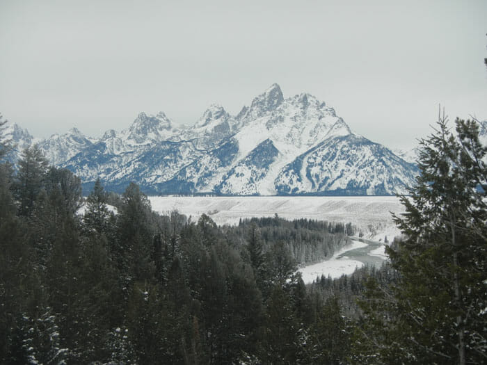 Snake River Overlook is the location where Ansel Adams took his famous photograph and is a balm for sore eyes. Left to right are Buck Mt., Wister, Static Peak, New Perce, Cloudveil Dome, South Teton, Middle Teton Teepee Spire (named after Frederick Teepee who died there in 1925), Grand Teton, Teewinot and on the right border is Symmetry Spire behind the tree. The Snake River cuts river terraces through the “Hole” and has for eons.