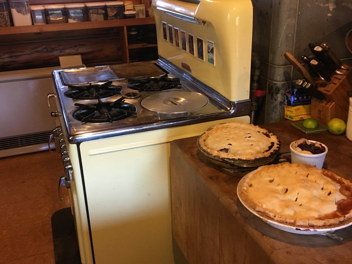 At last–pies: #11 and #12–Peach and Blueberry with a little extra tart from extra dough. I cook these in my mighty 1952 Chambers Model 90C stove/oven. Think of a 1952 Buick…… Solid as they come and weighing in at 450 lbs. All the heat is stored in the mass through a clever series of dampers to the oven.