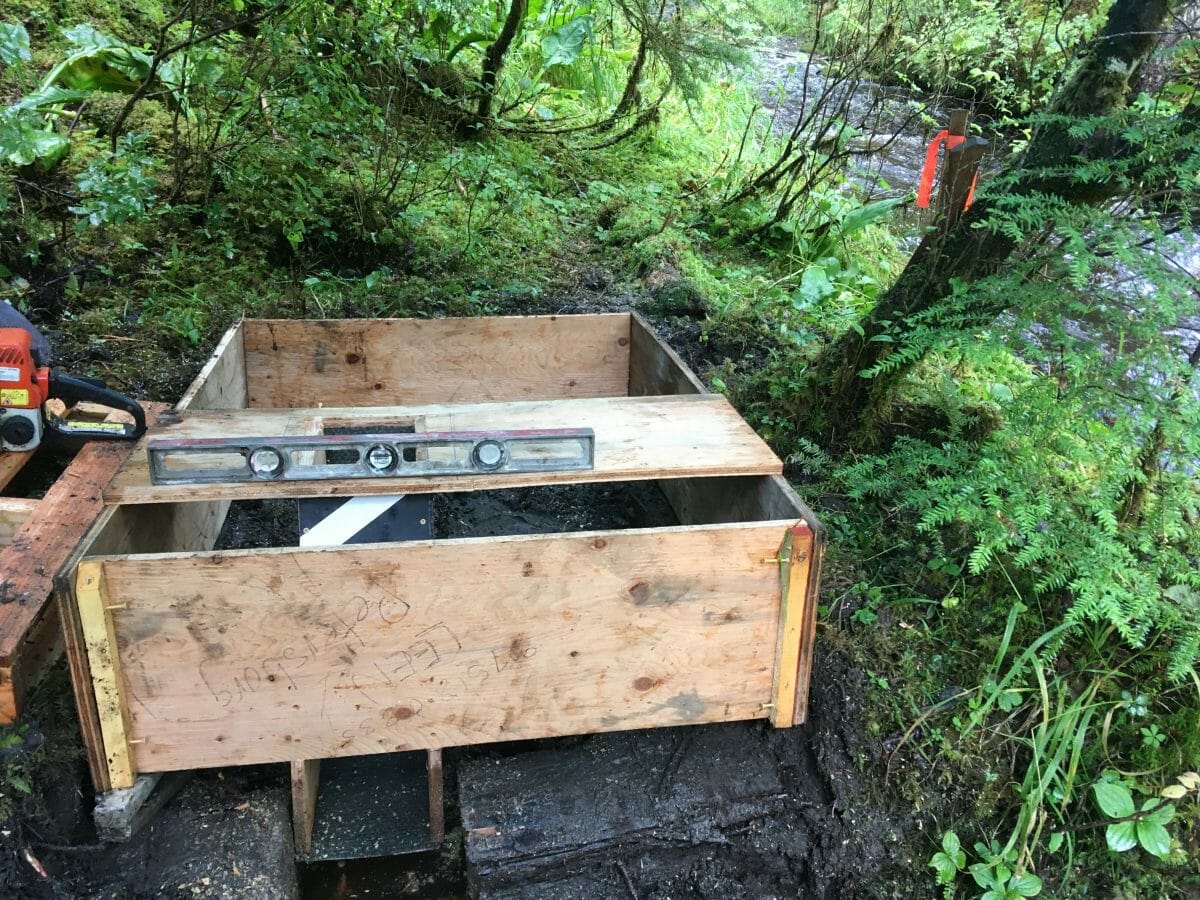 This is the form for the cement foundation for the turbine. The sluiceway is lower left and the creek is running about 3000 gpm on the upper right.
