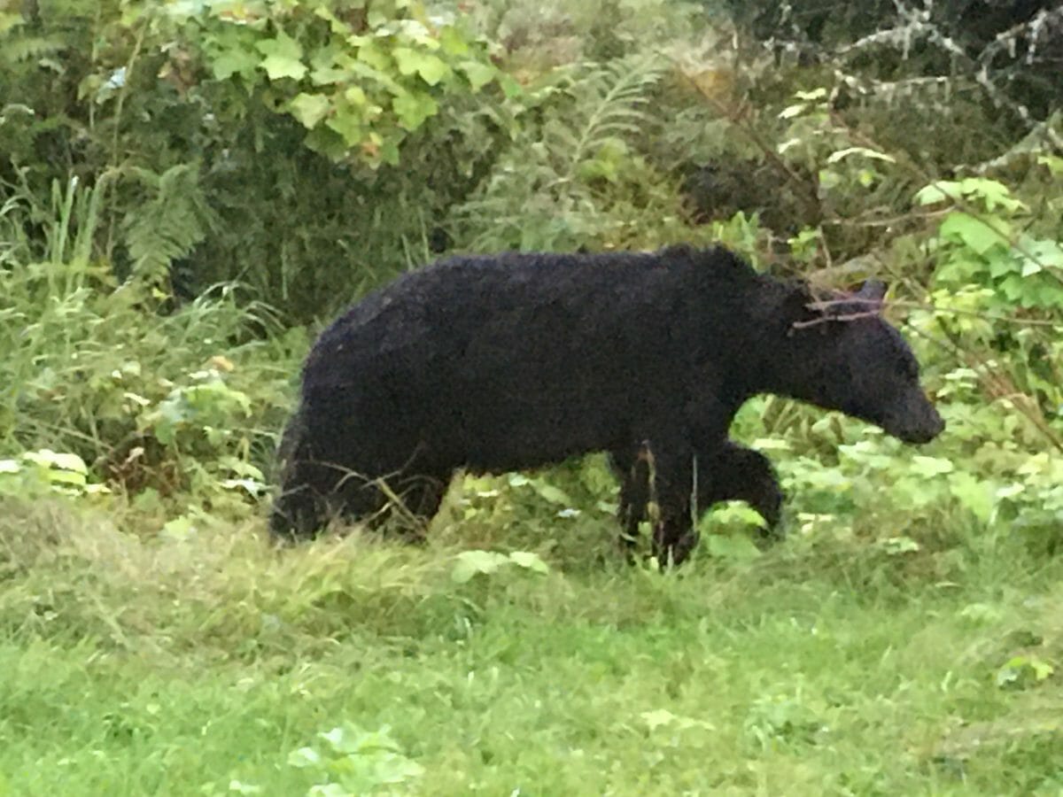 With all the rain, there are no berries and salmon runs are about 30% of normal. Here is proof–a bear walks right outside my dining window. Sad.