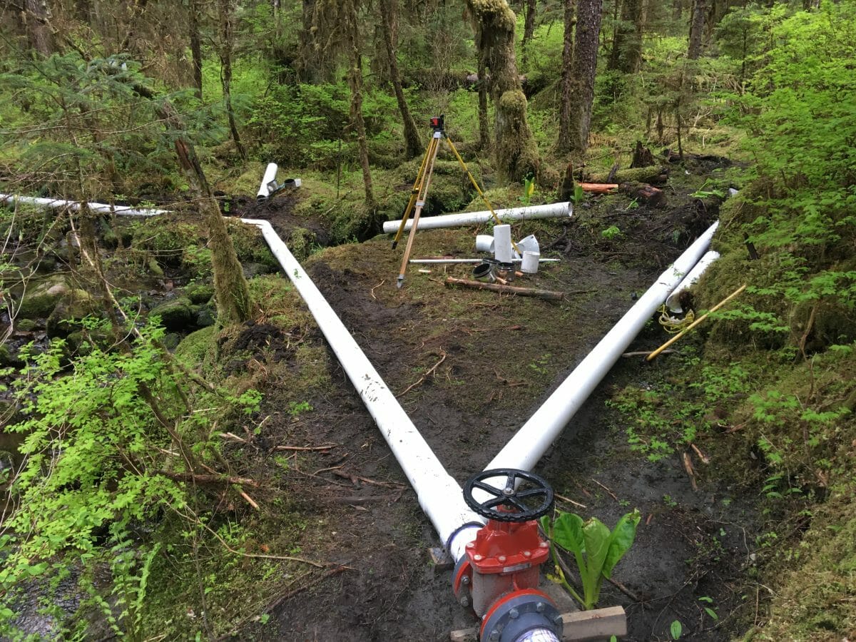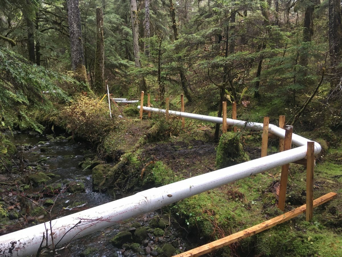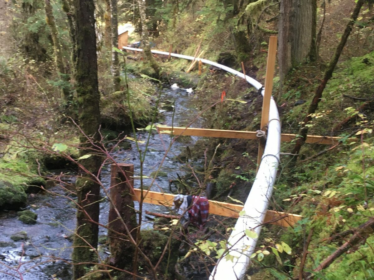 This photo is downhill about 100′ where it crosses the stream.  Supports are Alaska Yellow Cedar 2 X 4s which are adequate but will require augmenting a bit.  I’ve installed one 45° and one 22.5° elbow here to make this bend.