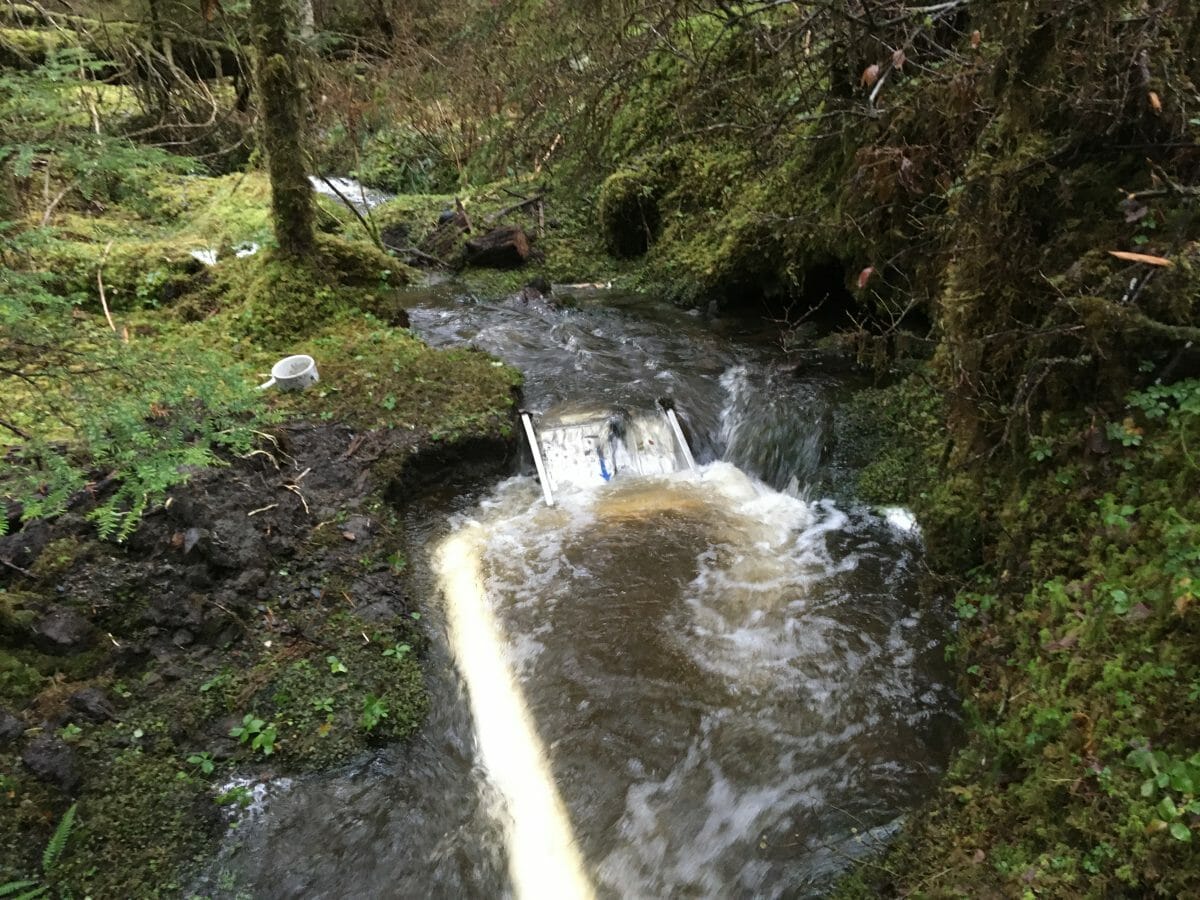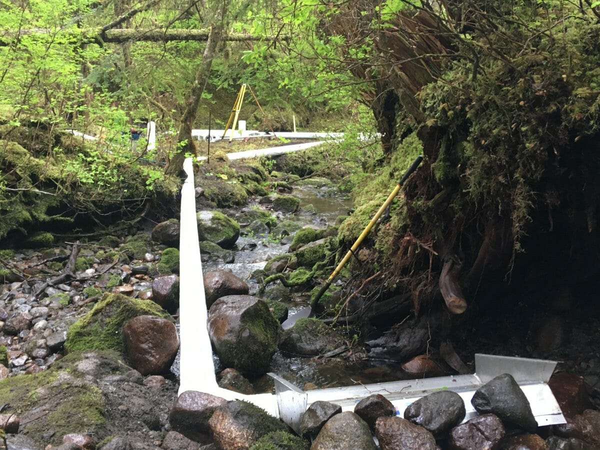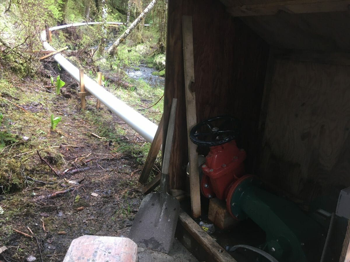 This photo is downhill about 100′ where it crosses the stream.  Supports are Alaska Yellow Cedar 2 X 4s which are adequate but will require augmenting a bit.  I’ve installed one 45° and one 22.5° elbow here to make this bend.