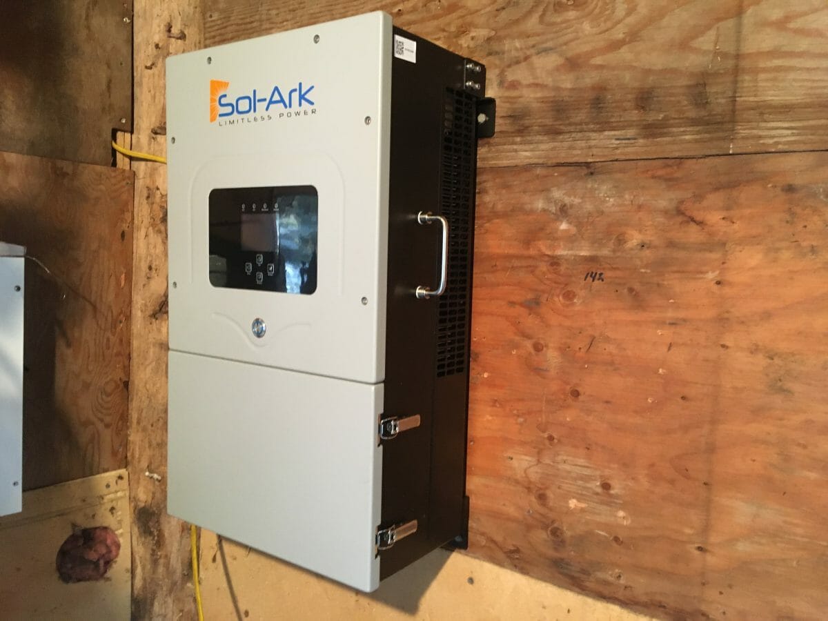 With some minor clean-up, I hang the new Sol-Ark.  Their customer service is tops, in fact, better than tops.  When I finally went online with it, they noticed an older firmware version and “pushed” the current firmware from their factory back East; all in a few minutes.  Now, that’s service.  I had earlier looked at Schneider which has taken over Xantrex and before them, Trace, and neither my dealer nor I could get them to answer the phone.  Sol-Ark is the new kid on the block and their technology is current (pardon the pun), unlike the competition who have lagged behind.  This is 12KW, has a “Smart-Load” feature and is closed loop technology.  Totally satisfied!