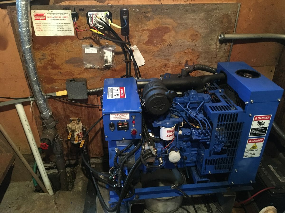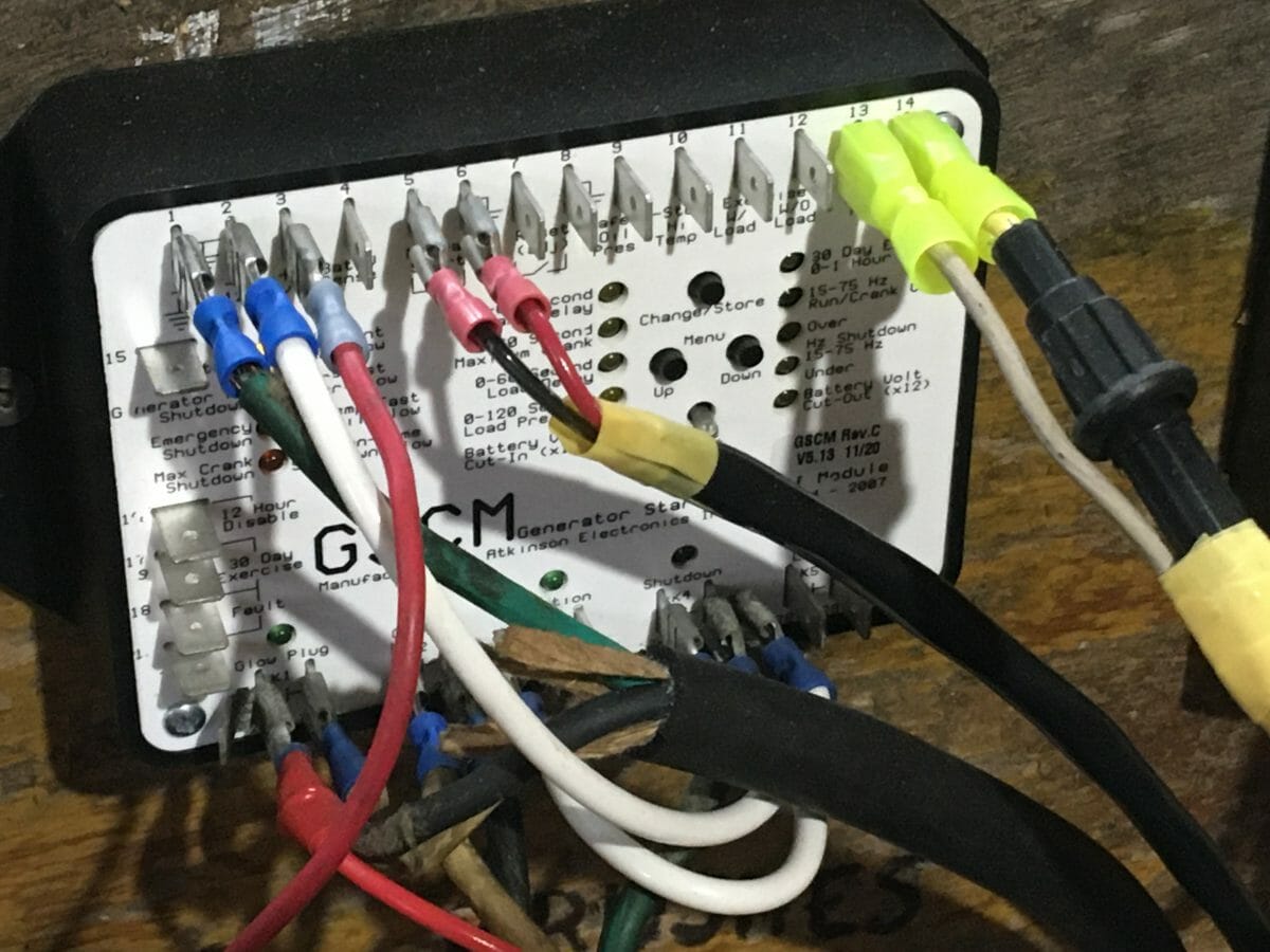 I haven’t mentioned much about the generator/autostart system which the Sol-Ark has to communicate with.  The generator is a Northern Light model N-673L 6KW diesel powered.  And it’s this diesel that has prompted me to “go green.”  And I hate hauling diesel fuel across the Wrangell Narrows.  The white box on the upper left is the control which ties to the engine/generator harness on the left of the generator.  Diesel generators have pre-heat features which need to be considered when autostarting.   Here’s a close-up: