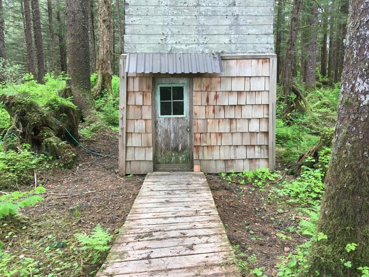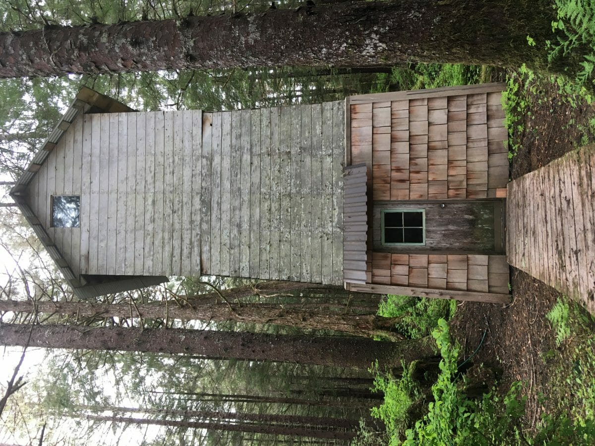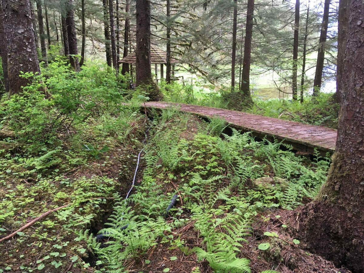 About…..face…..!  The last 25′–and the well house.  All house power & communication wiring is under this boardwalk but the hydro input comes in from the right in that ditch.