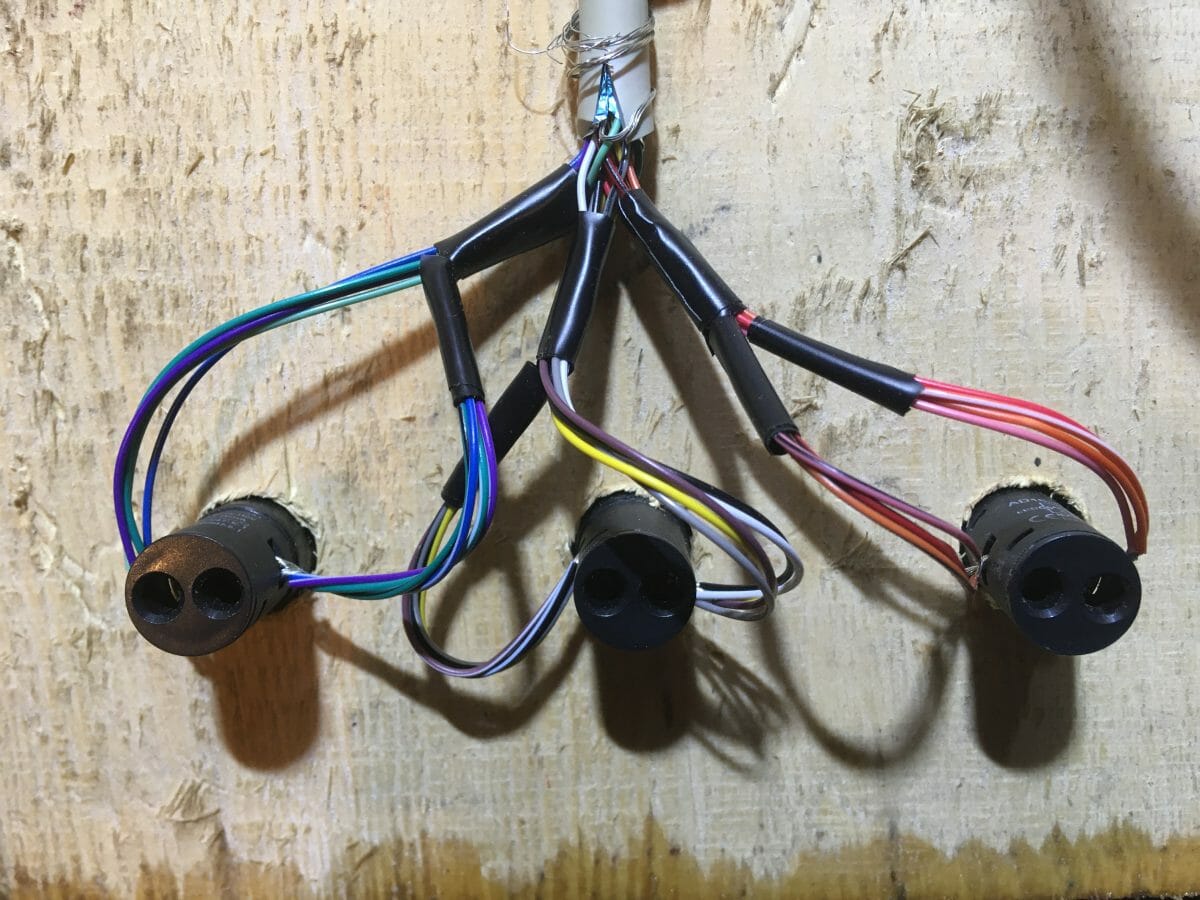And this begs the question of the red light.  These LED bulbs are 20 mA so draw very little current.  Now, to see these function in the house 150′ away, I need to pull new wires under the boardwalk and house which I am loathe to do.  But…..I have the old com cables from the Xantrex–one holding 25 #26AWG wires–which I can pair up and there are my 6 leads.