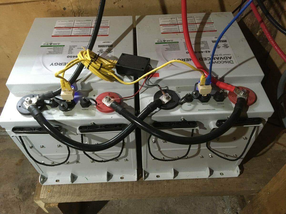 This was an autopsy after I rinsed it out and tried to dry it out–on the recommendation of the dealer “Be Utility Free.”  A google search of this company will bring up all sorts of nefarious posts which I will leave to the inquisitive reader–don’t neglect the Better Business Bureau in Colorado either, where I’ve filed a complaint.  These are the replacements–Lithium-Iron-Phosphate (LiFePO4)–albeit 260 AmpHours instead of the 400 for the NiFe’s.  The advantage here is that these charge quicker so my daily average run-time is now about 2-1/2 hours in stead of the 3.25 hours.  They also have a small footprint.  These are sealed and are warrantied for 12,000 cycles, which is more cycles than I’ve got left.  They are manufactured in Canada by Discover.  These batteries also talk to the inverter and to each other–note all the com-wires; i.e. are “closed loop.”  They have their own Battery Management Systems.  I was dumping 25 gallons into the old NiFe bank about twice a year or so–not these–they are maintenance free except for a firmware update.