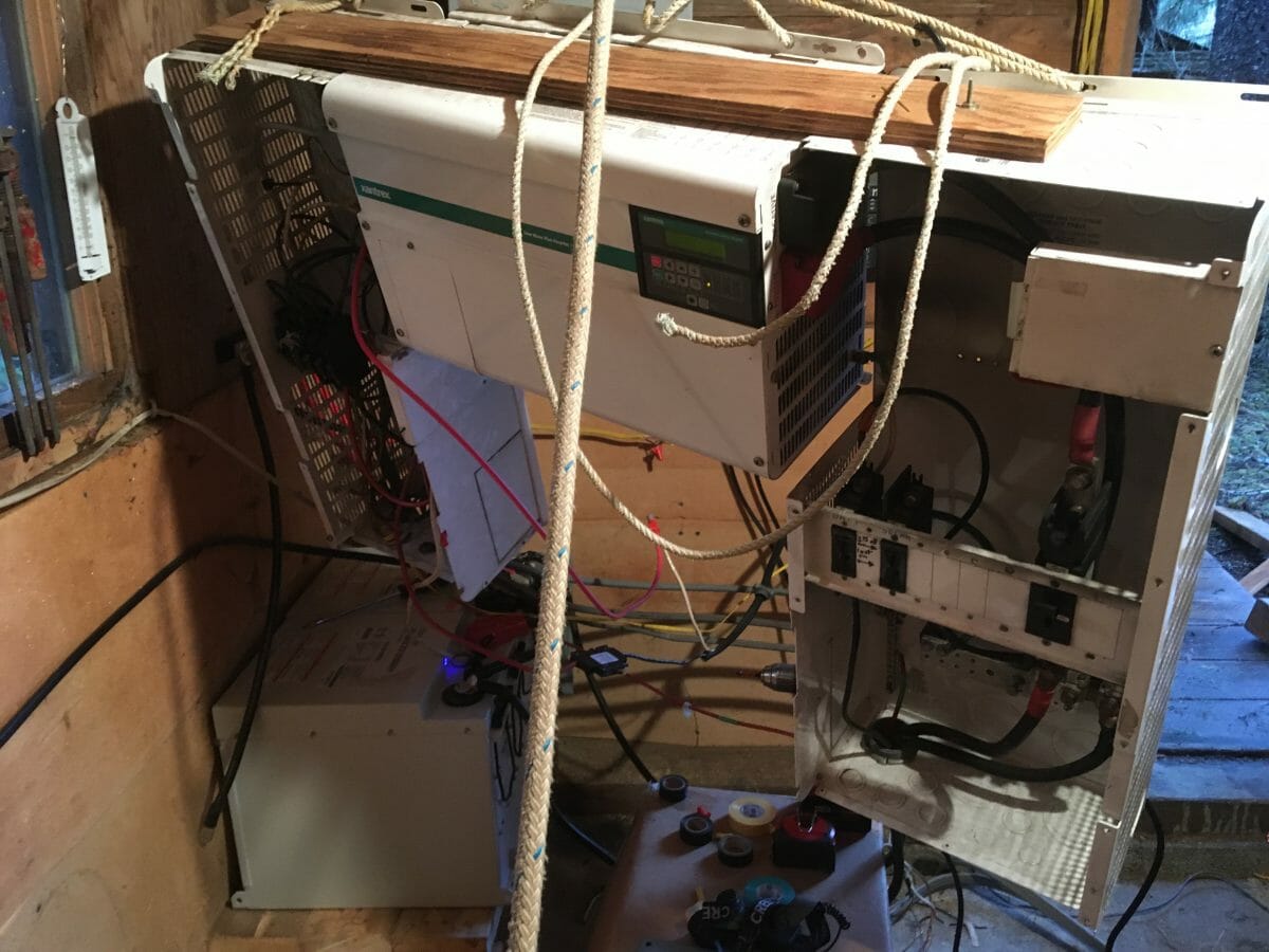 I first put an anchor on the floor and the ceiling beams–this Xantrex weighs over 150# and is one big magnet.  With pullys and heft, I carefully slide it down on skids and let it swing freely mid-air wires still accepting solar, generator and charging to batteries.