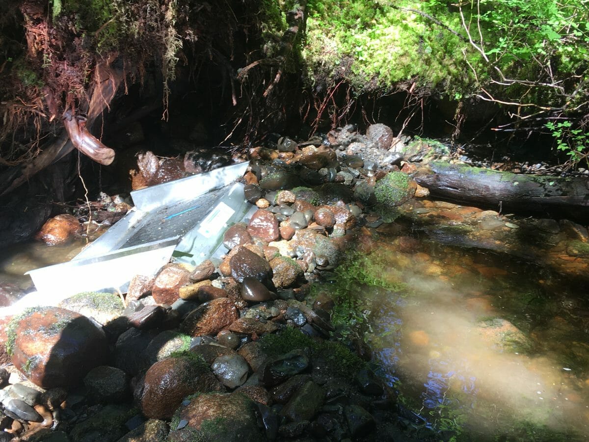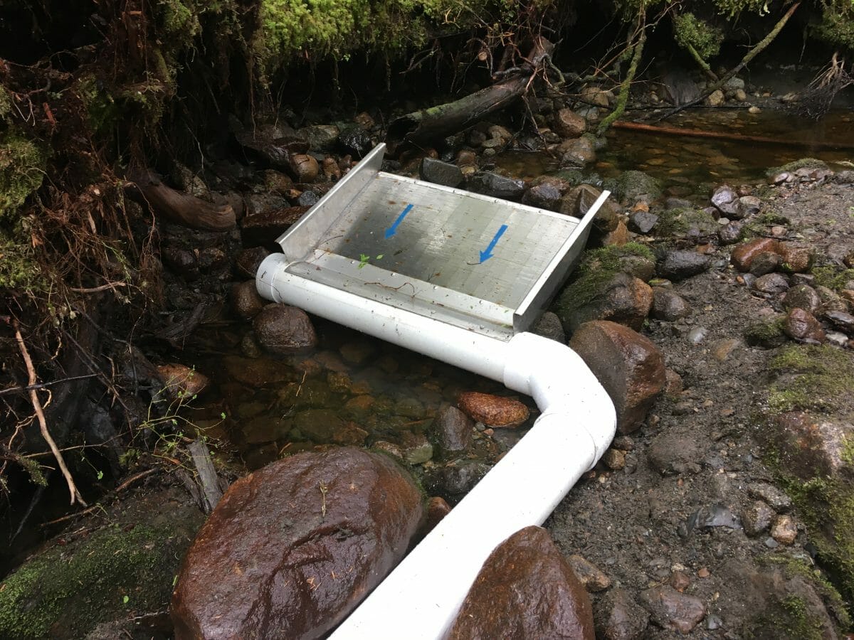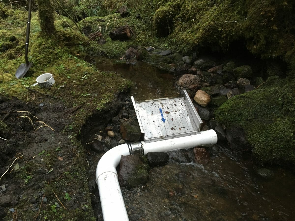 This is the West Intake as installed.  The west arm of my creek is only about 25% of the total flow.  I chose to have two intakes to allow the penstock (piping) to escape the stream channel.  Fifty feet below, at the confluence, I’m in a “canyon” and would have run in the creek bed which would be vulnerable to high flow damage, logs, etc.  .  By putting the intakes uphill a bit, I can capture the meadow at the confluence and also gain about 3 more feet of head pressure.  The slope here is only 1″ in 10′ but only for 50′ of the 458′ total run.  The total length of the penstock is 458′ with 28′ of head pressure; about a half inch drop per foot of run.  When it rains…..