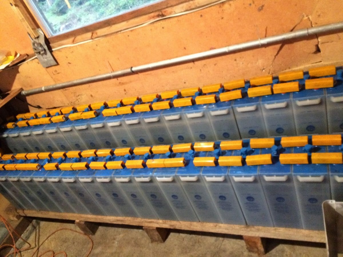So, now that we’re here in the well house, let’s talk electricity.  This is the old battery bank of Chinese manufactured Nickel Iron (NiFe) “Edison” batteries (Hangchong 400 Ah).  Goodyear owned the patent until 1970 and all “Edison” style batteries are now produced in China.  I am no fan of these as I’ve had 14 failures (out of 40 purchases–I’ve lost count).  I got 7 years of use out of these but they cost $16,000 and were advertised as “the last battery you’ll ever buy.”   Don’t buy these!  They are very high maintenance and I ended up spending more on distilled water than on diesel fuel.  If you use rainwater, they void the warranty.