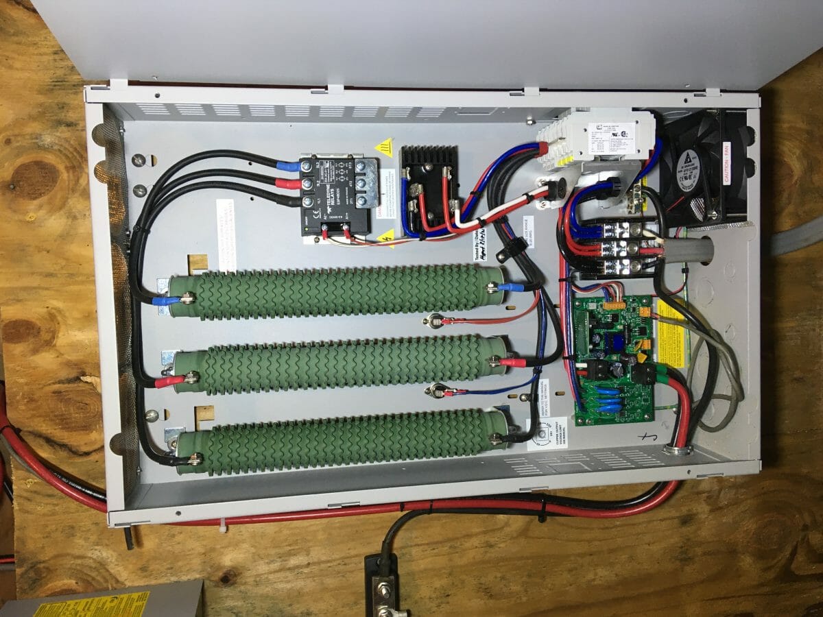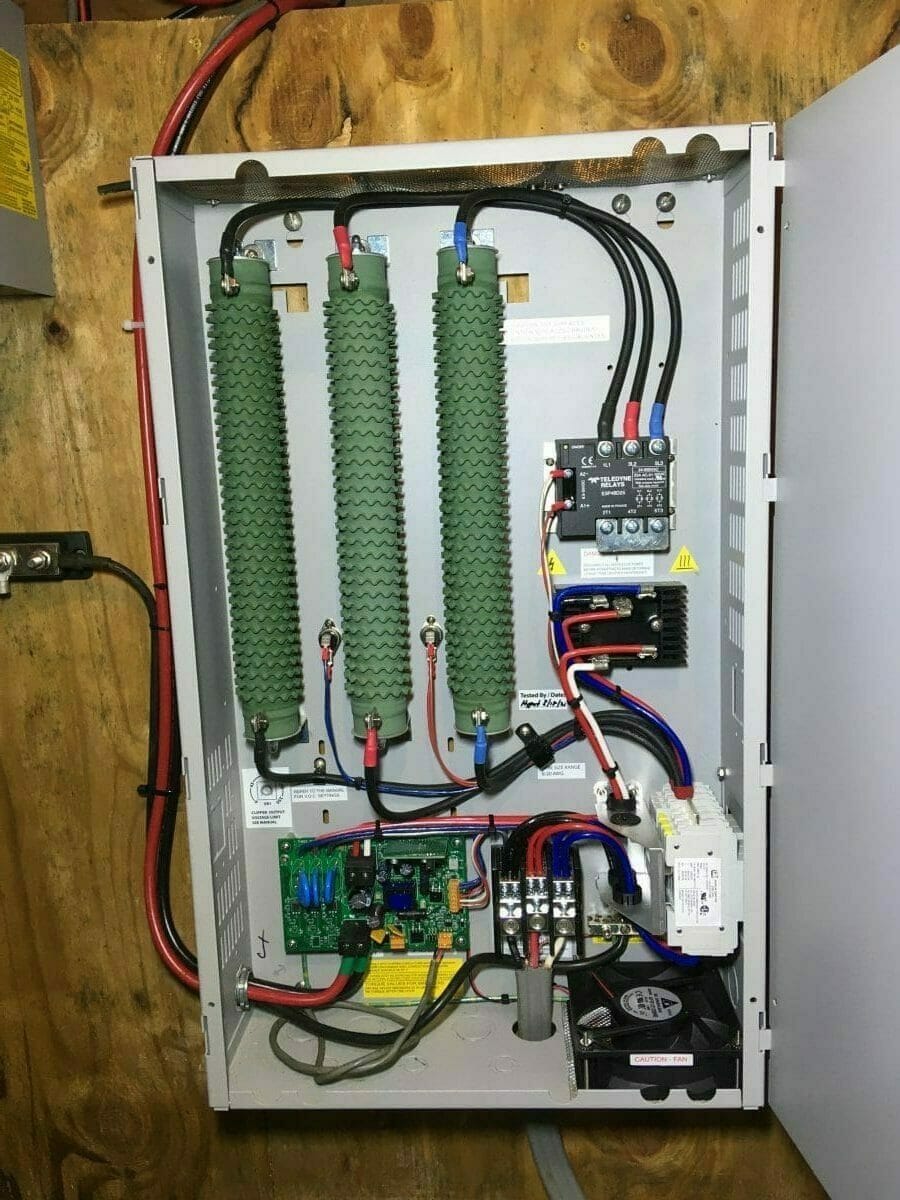 The hydro input (3 phase 125VAC) emerges from the floor directly below and goes through a rectifier first.  Out comes VDC and through a switch and into a circuitboard that either charges batteries or diverts into the three resisters (2 ohms).  If the “Smart-Load” on the Sol-Ark somehow cannot find the dump in the Tulikivi heater, then this will jump in and save the day (and heat my wellhouse).
