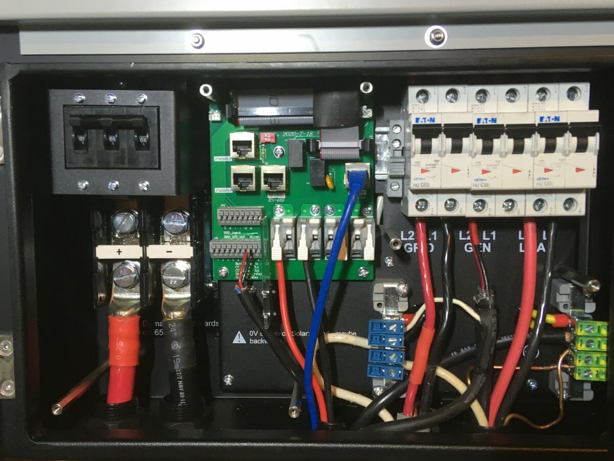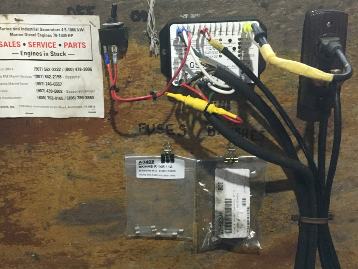 Note the extra fuses and an extra set of brushes for the generator (they wear out about 3000 hours). I also have the customer service phone numbers for Northern Lights–again–a five star rating from the Commodore of the South Kupreanof Yacht Club.   Now–the control unit…..I’ve installed a cut-out switch.  The two upper right tabs are fully insulated as they’re 120VAC–a feedback loop that tells the Sol-Ark to quit cranking the bendix so it doesn’t wear out; a great improvement over the Xantrex.  The plug below this feedback loop is for…….think hard….the green light.  This circuit lights up only when the generator is running–a feature that tells the auto-start to quit cranking the starter.