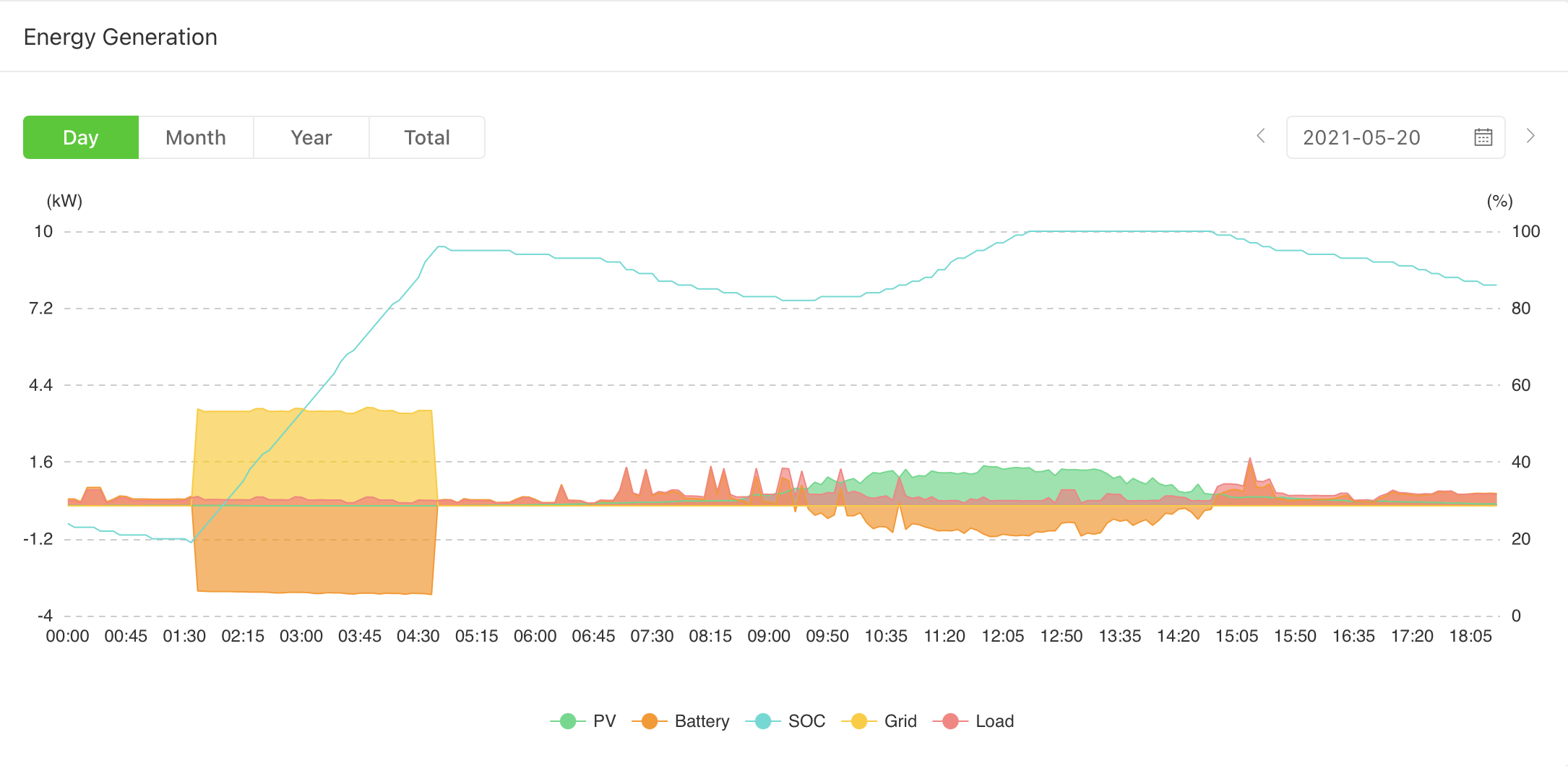 Above is an 18 hour graph of energy distribution.  The tan/orange block is a 3:15 hour charging cycle by the generator beginning at 1:30am.  The first spike is the morning coffee-pot and then the sun comes out (barely) which is shown in green (and orange below is the absorption into the batteries.  The light green line is the State of Charge (SOC) of the batteries, building during the charge cycle and decaying during periods of loads.  The hydro/creek is not flowing.