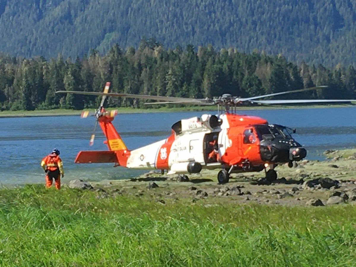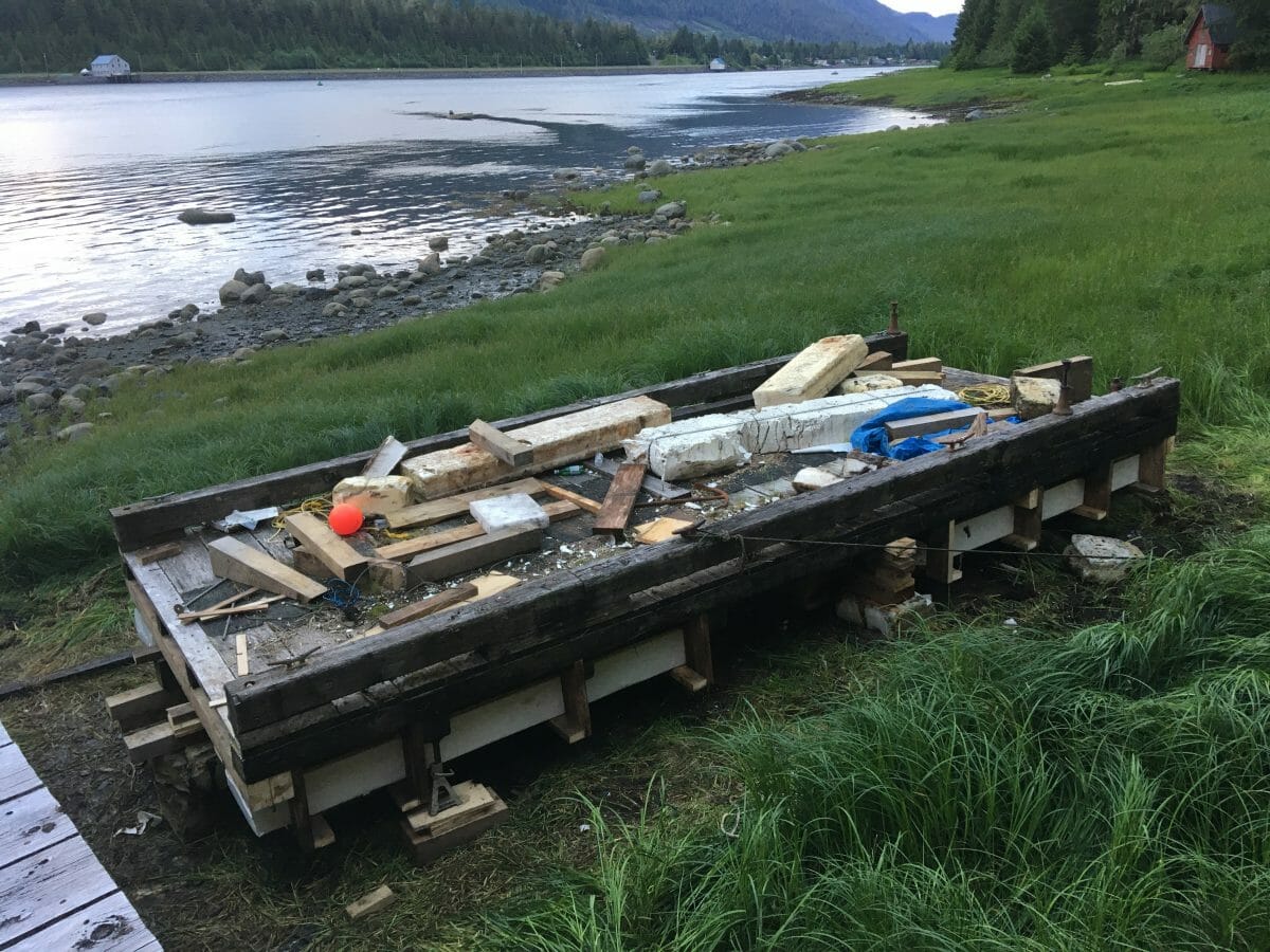 I have very few visitors here on Kupreanof Island, if any, but yesterday I had two.  First two BLM employees (that’s Bureau of Land Management to you city folk) arrived to seek out a 1926 survey marker near my property so I provide a tie-up on my new outer float and lead them on a trail to my point where they begin their exploration.  Meanwhile, someone shoots a distress flare in the immediate vicinity and a report is received that there is an inverted floating hull and life jacket floating in the water.  So the USCG dispatches a helicopter from Sitka which flies down Kupreanof Island and lands on my beach and seeks my opinion……a day in the life of the Commodore (of the mythical South Kupreanof Yacht Club)…..   Stay tuned.