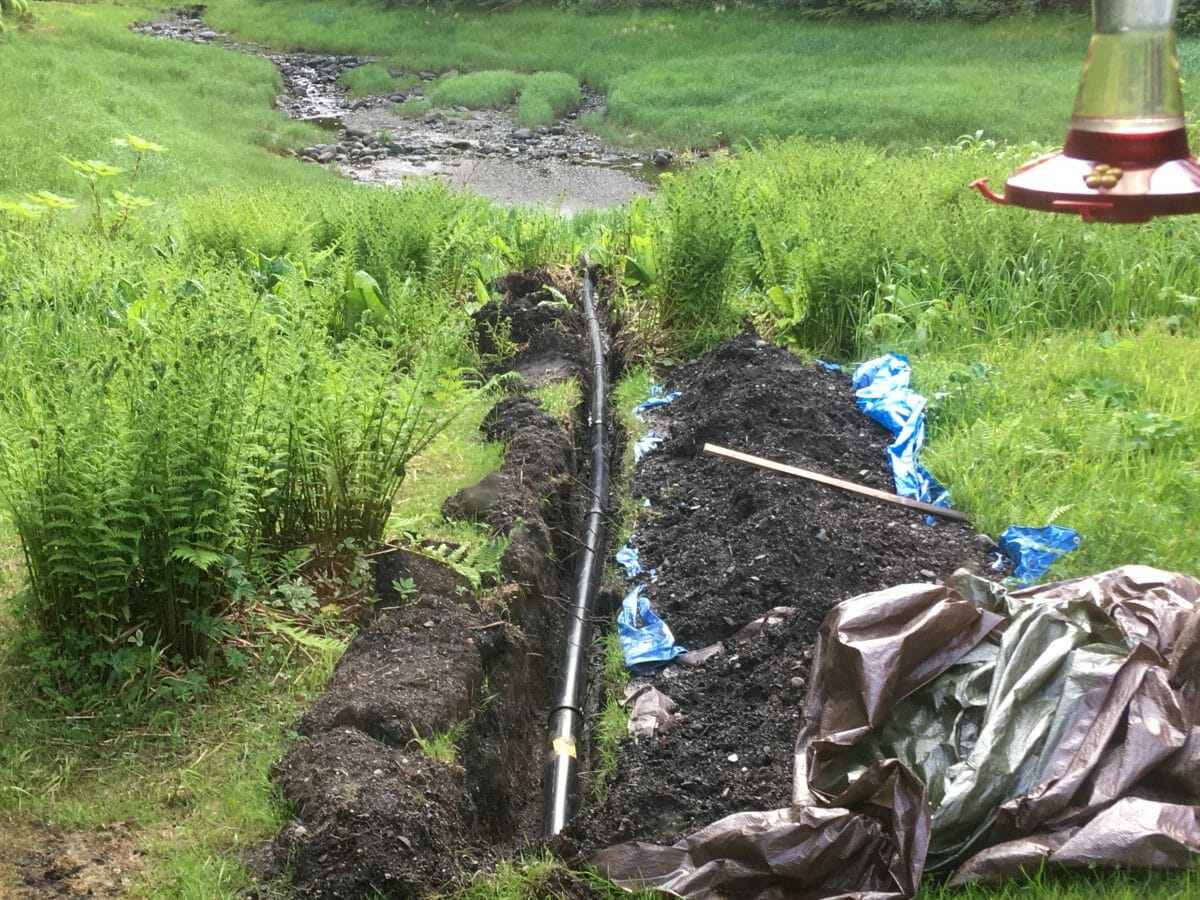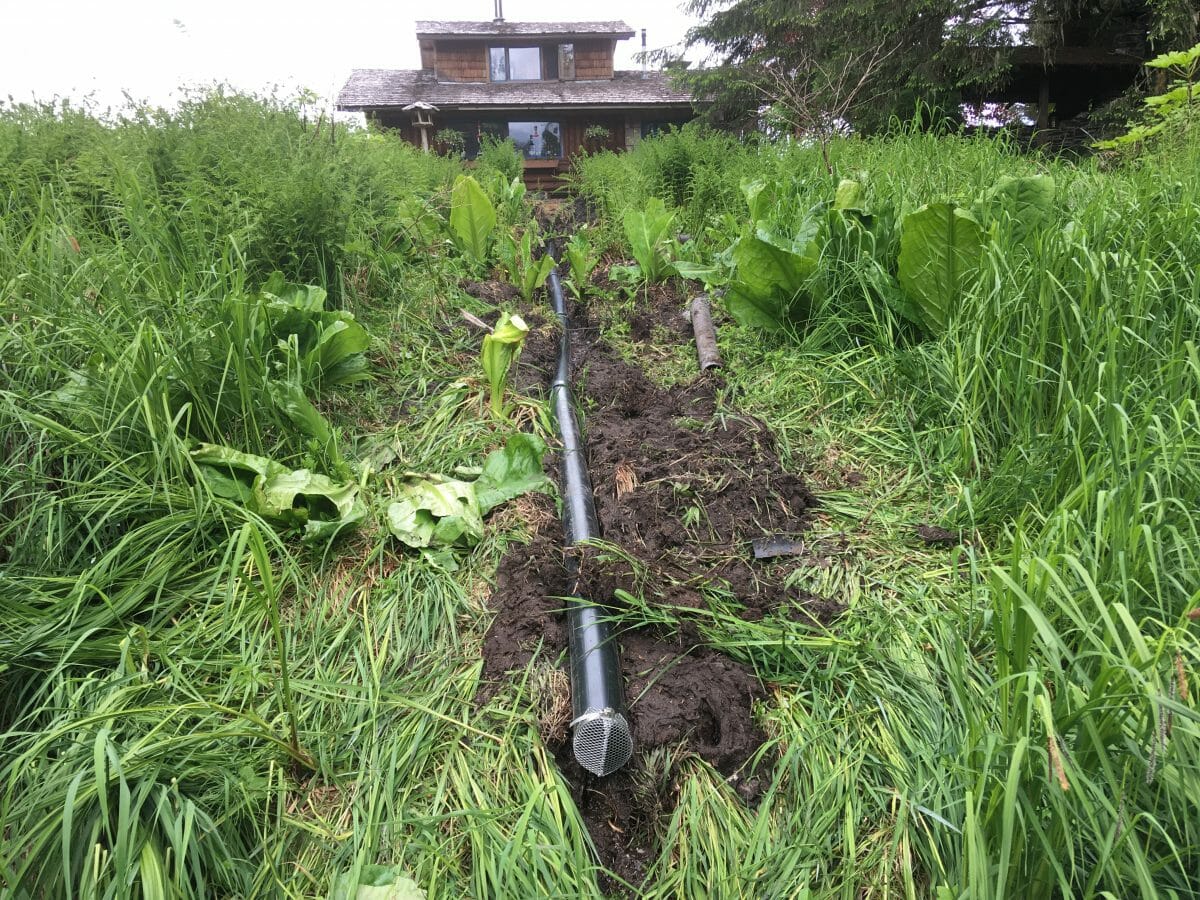 My gray water line from the house plugged up after 50+ years, so out comes the shovel (and chainsaw) to cut a trench through the muskeg.  I replace the line with new schedule 40 PVC.  What a pain.  It ran 100′.