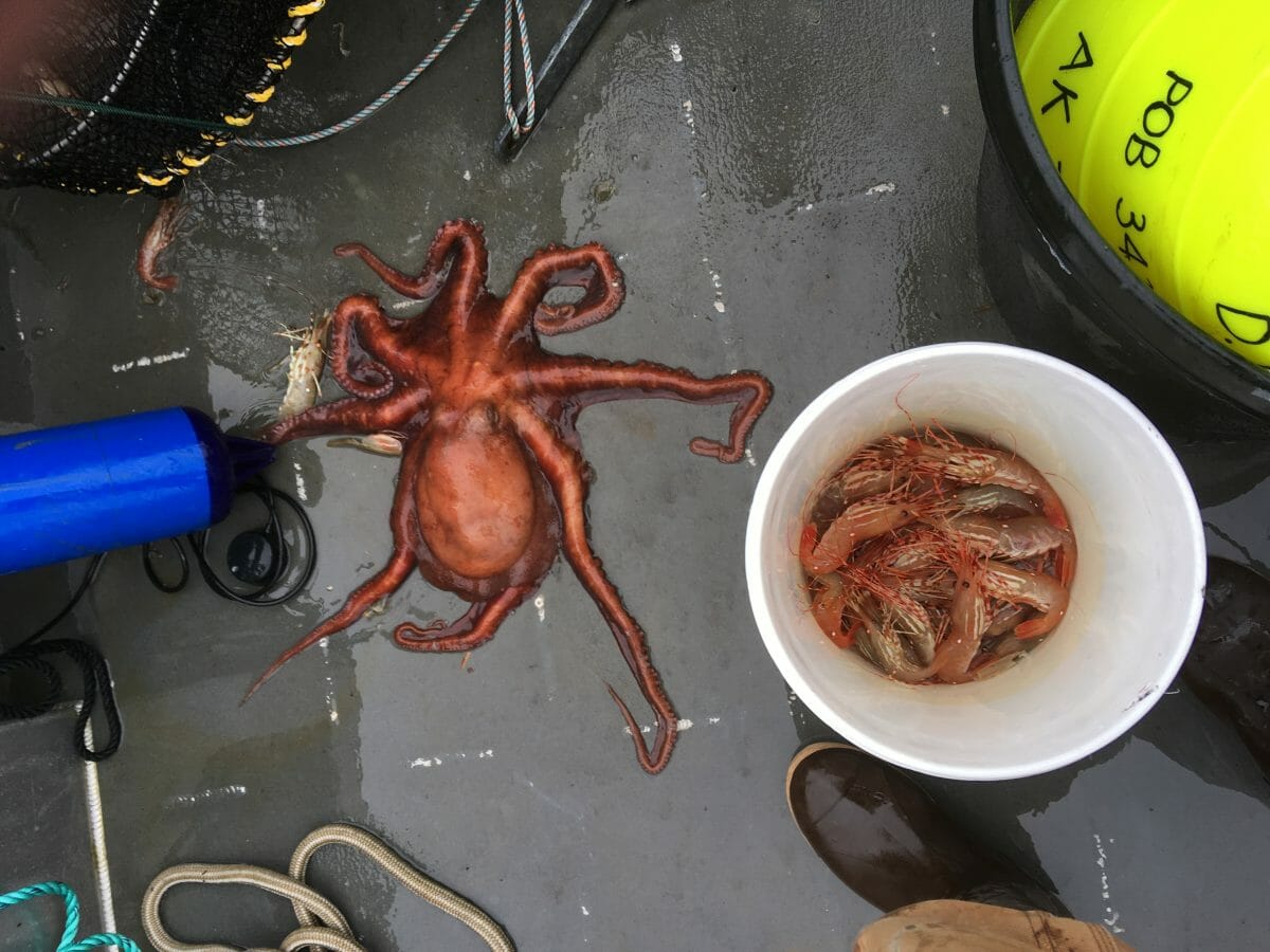 Prawn traps also capture other critters.  These animals (octopus) are very clever and this one actually unscrewed the bait box in my prawn traps.  For his/her cleverness, the Commodore grants a pardon…..