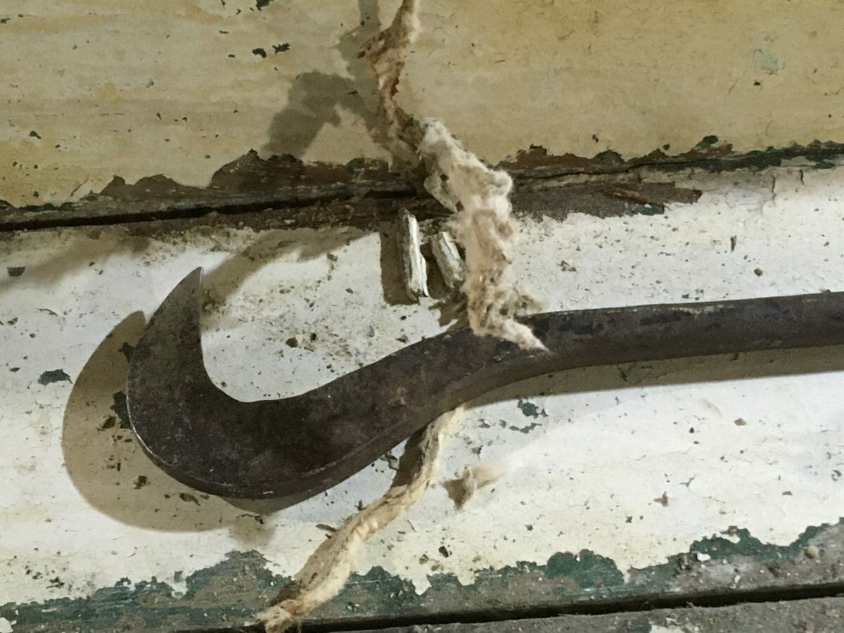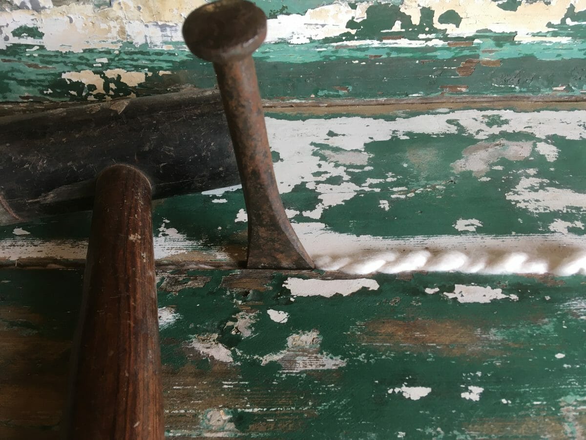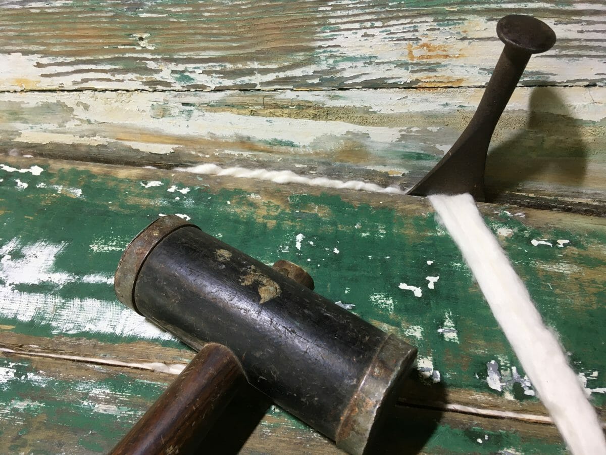 This reefing iron is pretty large (built in Port Townsend for my tugboat which has 3″ thick planks) but it’s nicely tapered and worked fine. This old cotton was likely caulked in the 1920s. This boat is an excellent design and construction.