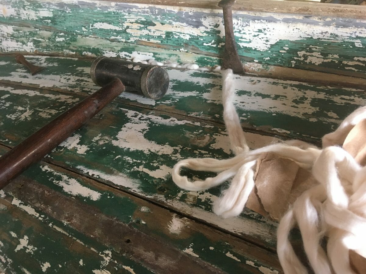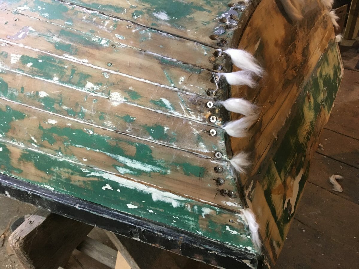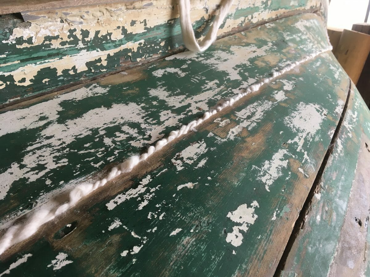 Because the planks have shrunk a bit and some internal damage has occurred, I caulk carefully with one seam of cotton; first threaded in, then set with a wider iron.