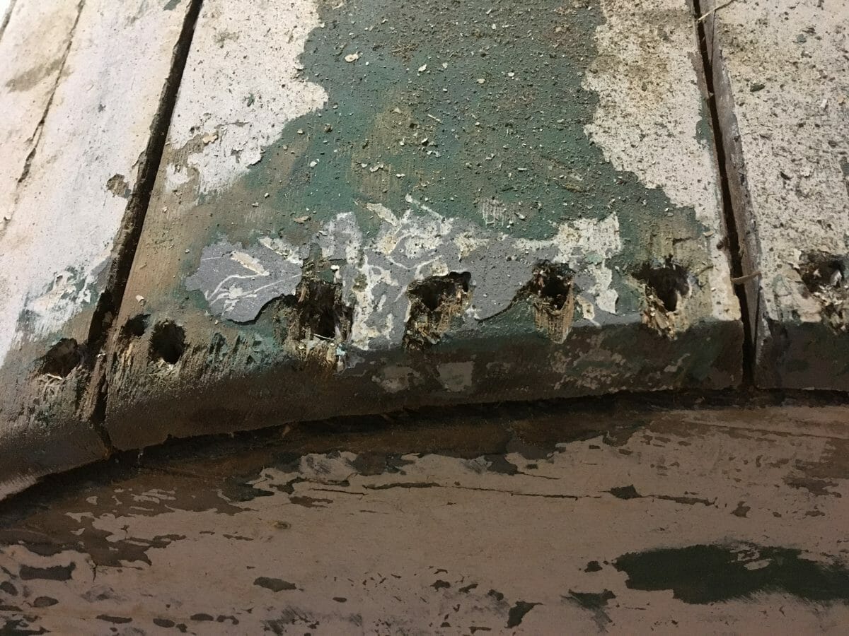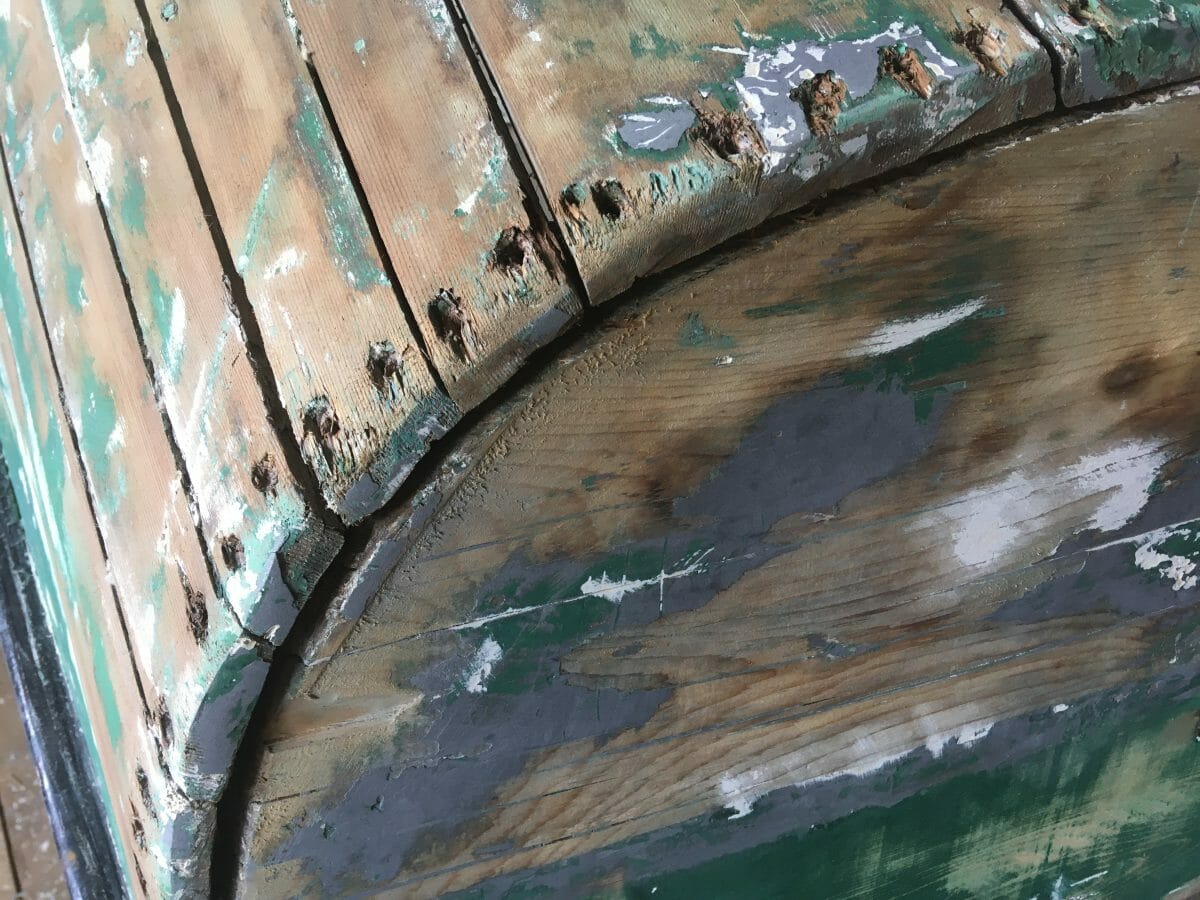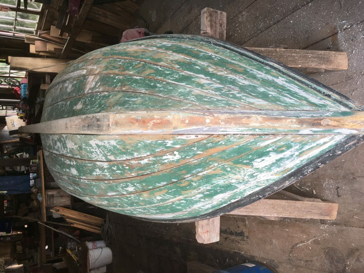 Note what appears to be a crack in two planks–this is really a cut made in the plank that runs 2/3rds the length of the boat, then stops. I have never seen this but it appears it was designed into the construction to make the planks fit better at the chine of the boat. Here is where it terminates–about three feet short of the bowstem: