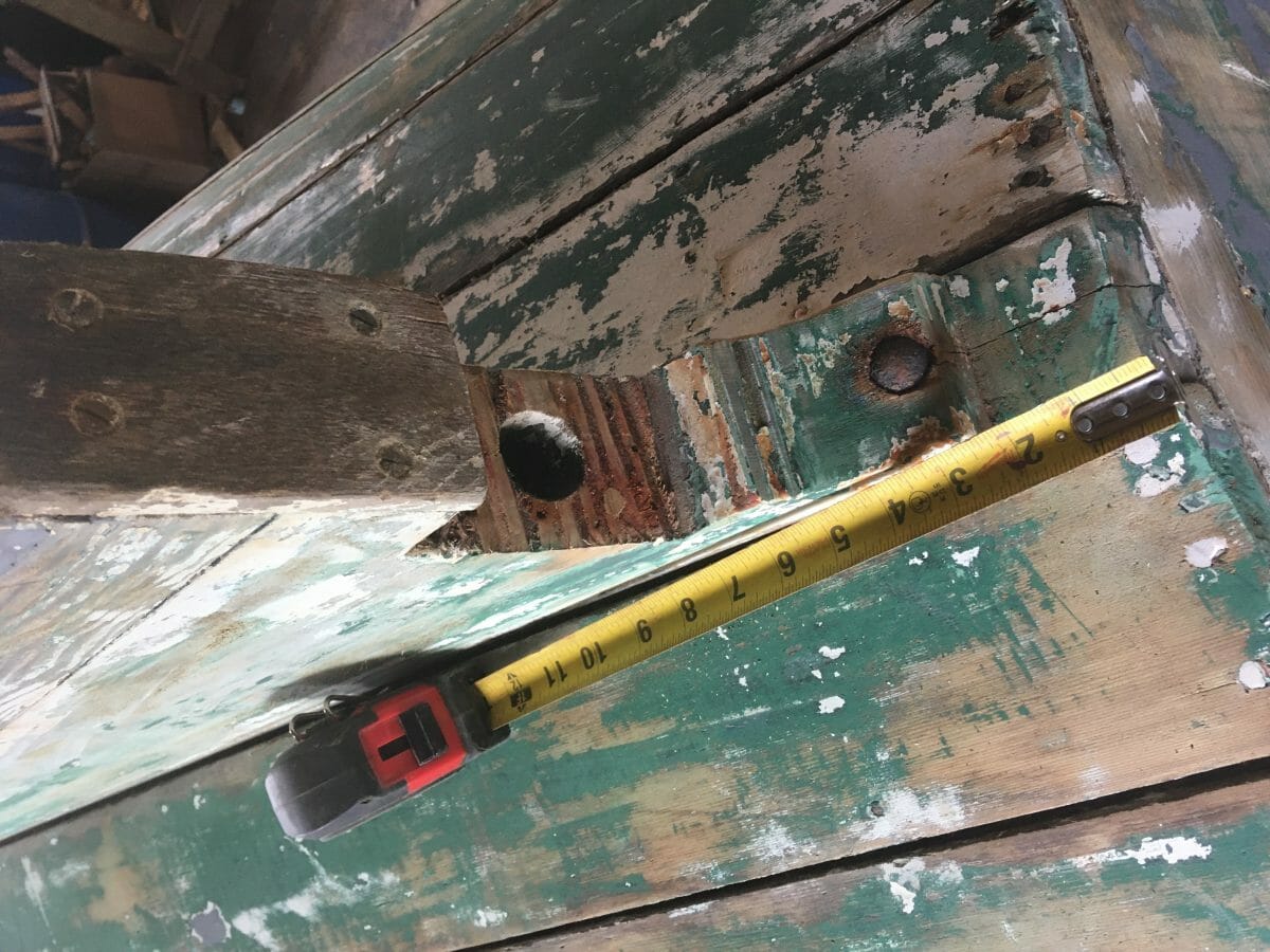This is typically what I find–I removed three styles of fastenings here including a monstrous copper nail a quarter inch in diameter! For this round, I’ll use three new fasteners and plug the rest with oak wooden dowels. Then I’ll caulk everything. I’ll use stainless, square drives about 2″ in length to get into newer wood. Fortunately, there is no rot on this boat–it’s red cedar planking on oak frames.
