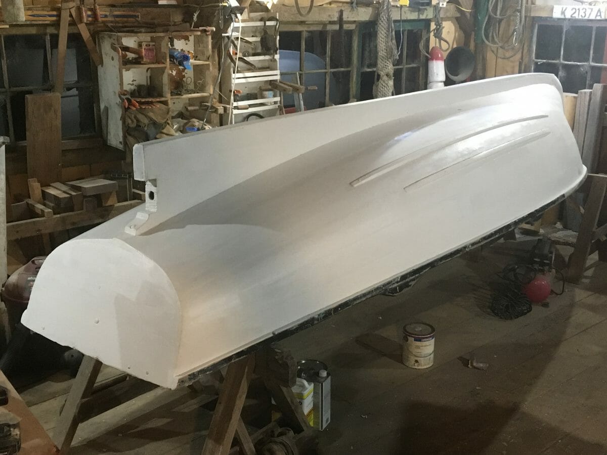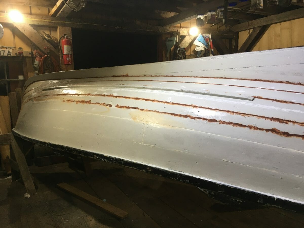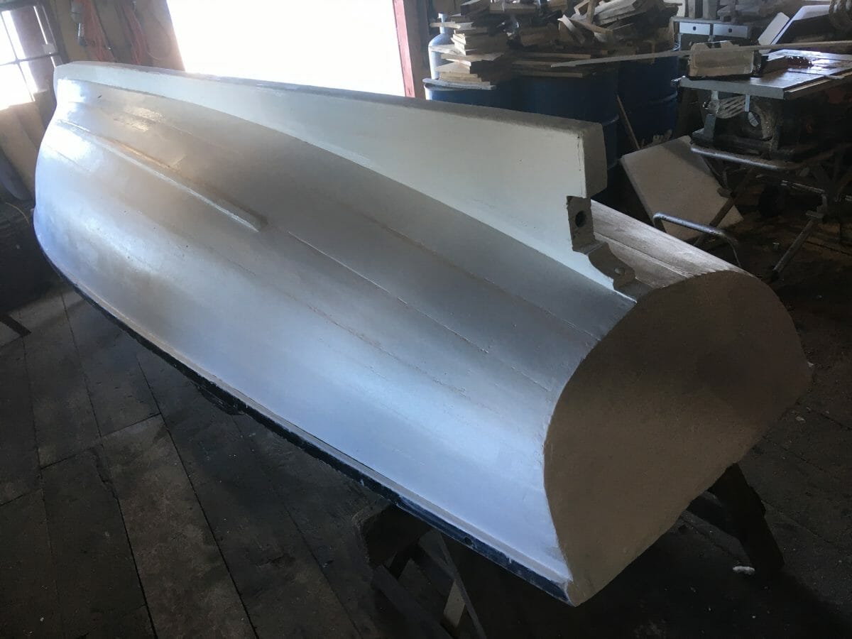 OK–all the paint is dry and I do aa couple rounds with fairing compound and do a final coat of prime, after a 80 grit sand. I would have used bottom paint, but I’ll add bottom paint next year when the engine has been installed and I refloat the boat to get the actual waterline. Nothing worse than a crooked waterline.