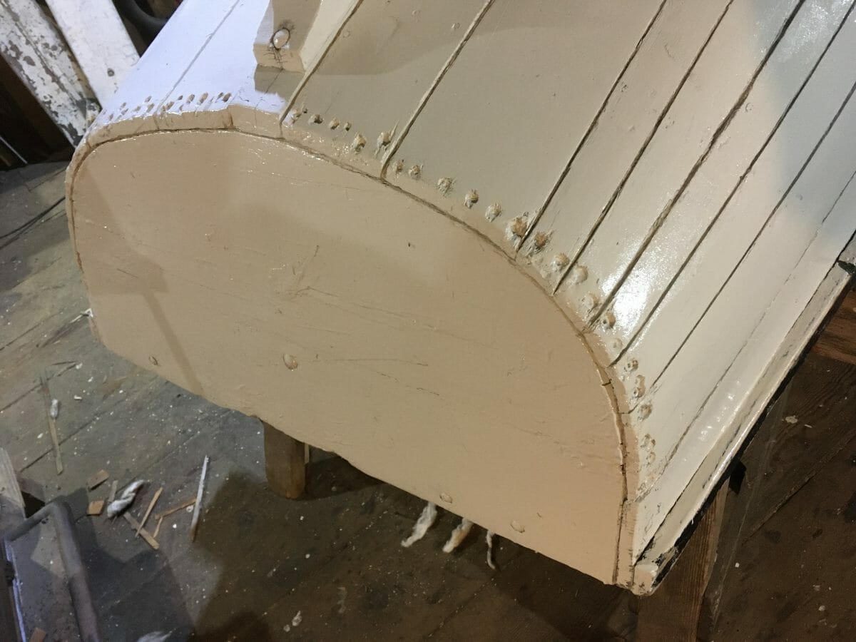 The next step is to repair the fastening holes. They are countersunk to gain more firm wood–I followed each original hole and likely a second refastening adding just a few new fasteners. I initially used Interlux’s seam compound but it aabsolutely won’t set (it’s over 5 years old–and as fluffy as cake-frosting); so I reef it out with a toothbrush and paint thinner and do it all over–with a second seam compound which also is too soft. Finally I resort to epoxy based filler and seam compound only in the seams–where it belongs!