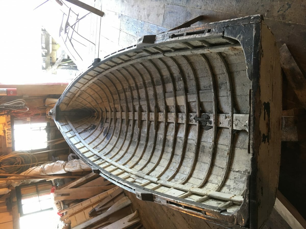 Meanwhile…..I flip the boat vertically–I prefer to strip the interior this way rolling it 180 for the other half.