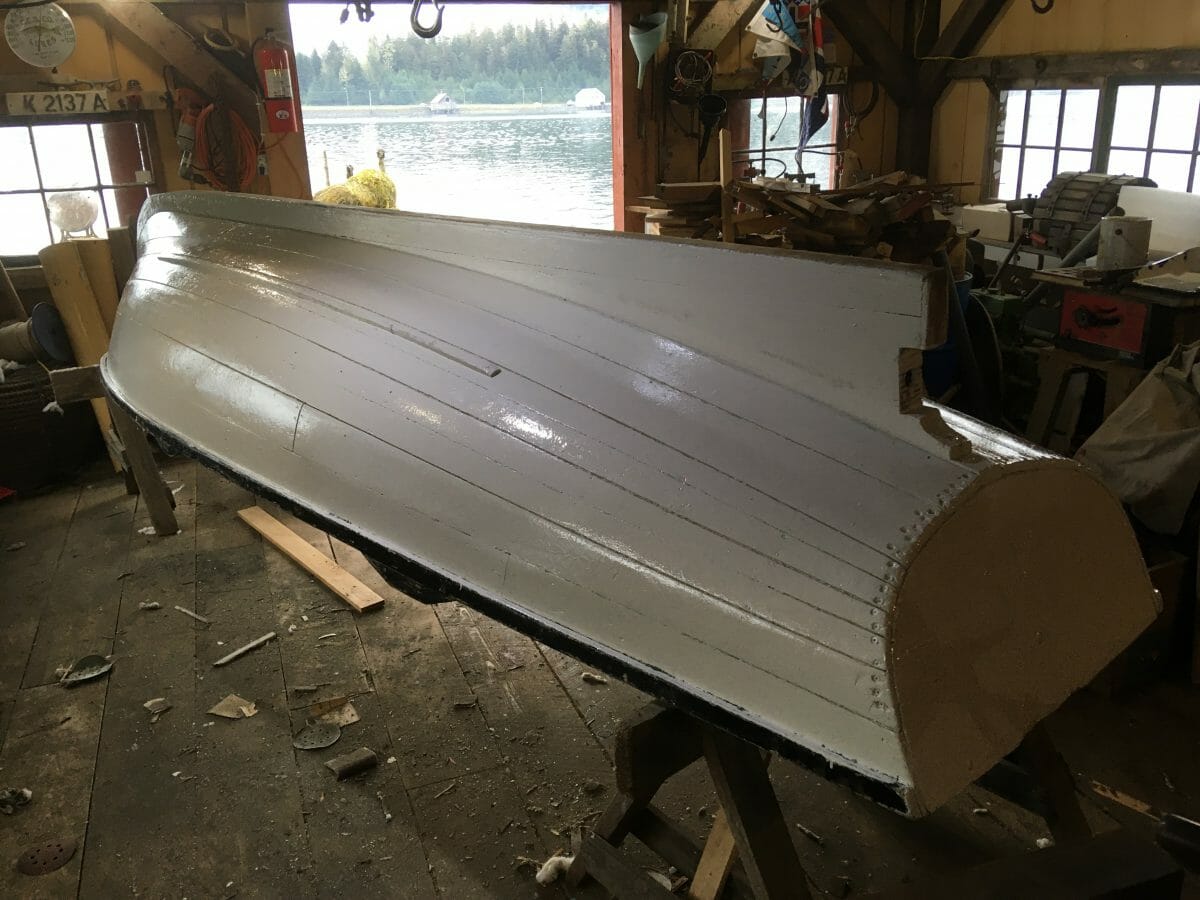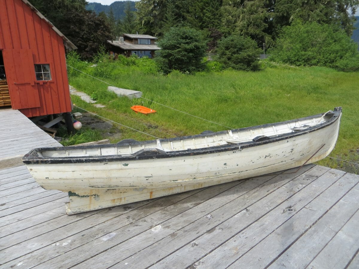 What’s better than spending the last hour of the day sanding a boat like this…… This 15’ foot motor boat has been sequestered away under a Petersburg waterfront warehouse for three or four decades—with only the highest tides able to slap its hull. I finally talked our retired harbormaster, Jim Stromdahl, out of this project and it has sat for a couple years in my warehouse while I replaced some major beams and all the facade to mine. So now it’s time to get to work after clearing out enough floorspace. Leif was Jim’s father who was a Norwegian who bought this boat for his kids way back when–so I’m naming this restoration “Leif.” It was originally owned by Magnus Martin and was thought to be a “Davis” boat built in Metlakatla. Perhaps not, but it makes a good story and it’s a beautiful hull–let’s get to work! (stay tuned more posts on the restoration…..) Here’s how I discovered her: