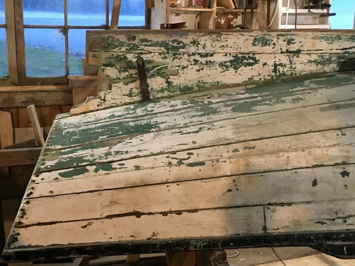 Stripping begins. The planking is loose to the transom so the fasteners are pulled–it’s been refastened three times and there is not much wood left. I’m tempted to move the transom forward an inch and get into fresh wood but it would shorten the boat by that much. I use a new cordless Milwaukee orbital sander but it’s still tethered to my shop-vac. Nasty dust.