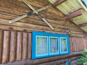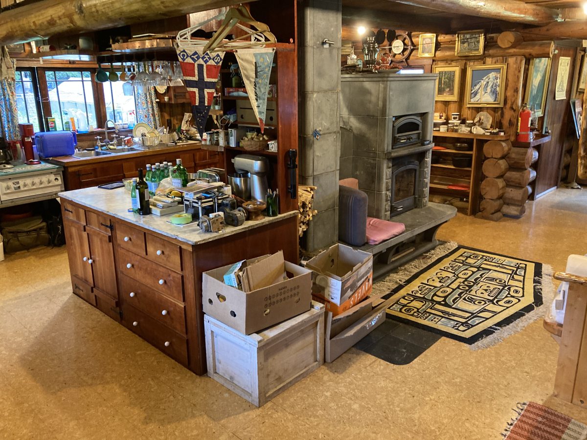 A typical one-room log cabin in Alaska–been here now 18 years in this cabin and hope to make another 18. My “Chilkat” blanket is made in Nepal and has a 40% pagoda look to it. The Norwegian flag hangs with the Ross Island Yacht Club of Antarctica burgee–and has been through the NW Passage thanks to Polar Bound (posted here).