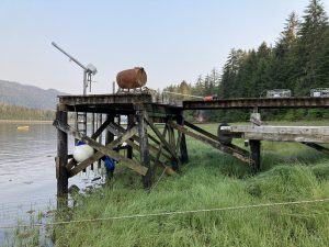 When living off grid, one needs a dock. Here is a 14′ tide, but tides range from 22.5′ to minus 4.5′ for a total displacement of 27′. They are higher only in the Bay of Fundy and Cook Inlet. My Thern crane still works although it’s slow. I re-rigged all my propane tanks to haul in pairs and bought an expensive gas detector to find a leak. There is still a small one perhaps under the house–and propane sinks so that’s first on my list next Spring when I return. The hose fittings are to blame which are made off-shore. Ross Perot was right, that we’d hear a “great sucking sound” if we shipped our manufacturing overseas. This is actually a loud hissing sound but Ross had the right idea. (I voted for him).