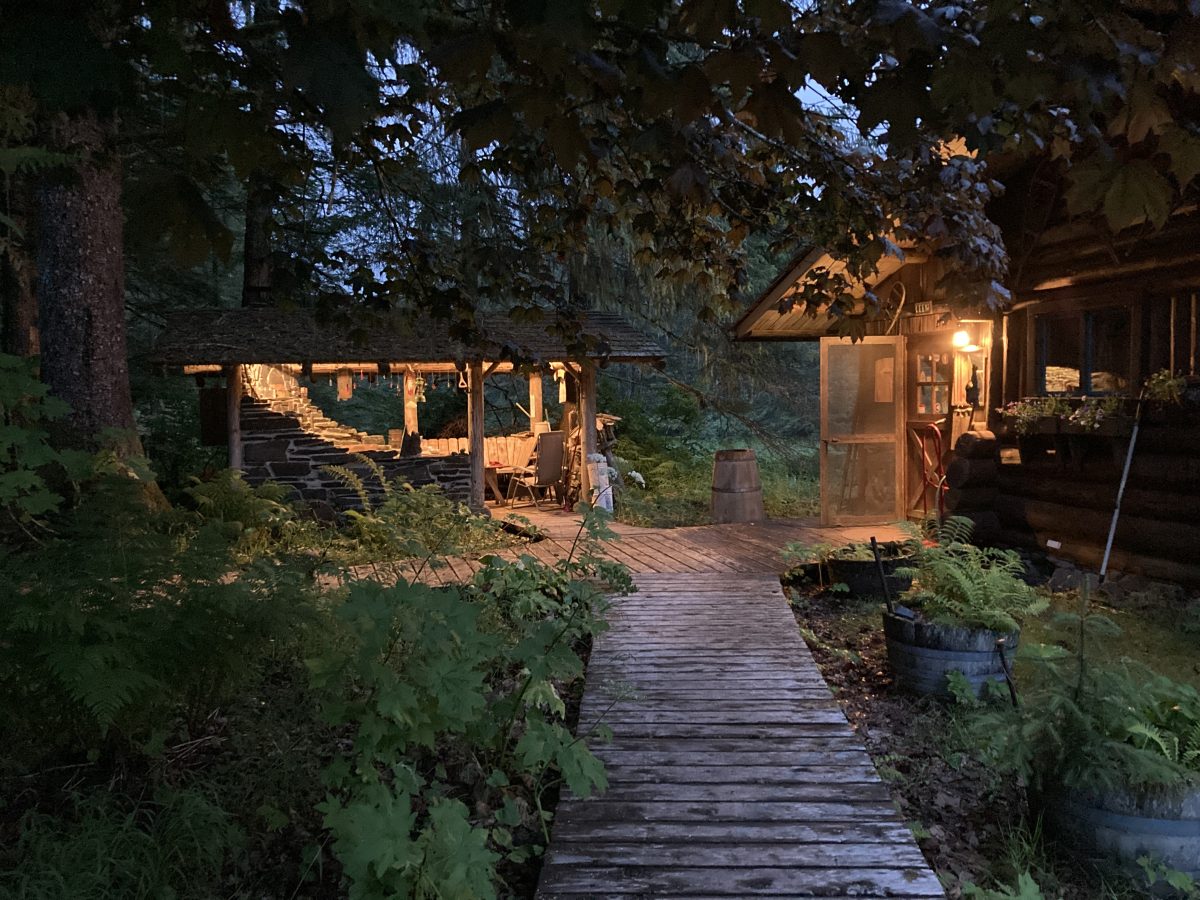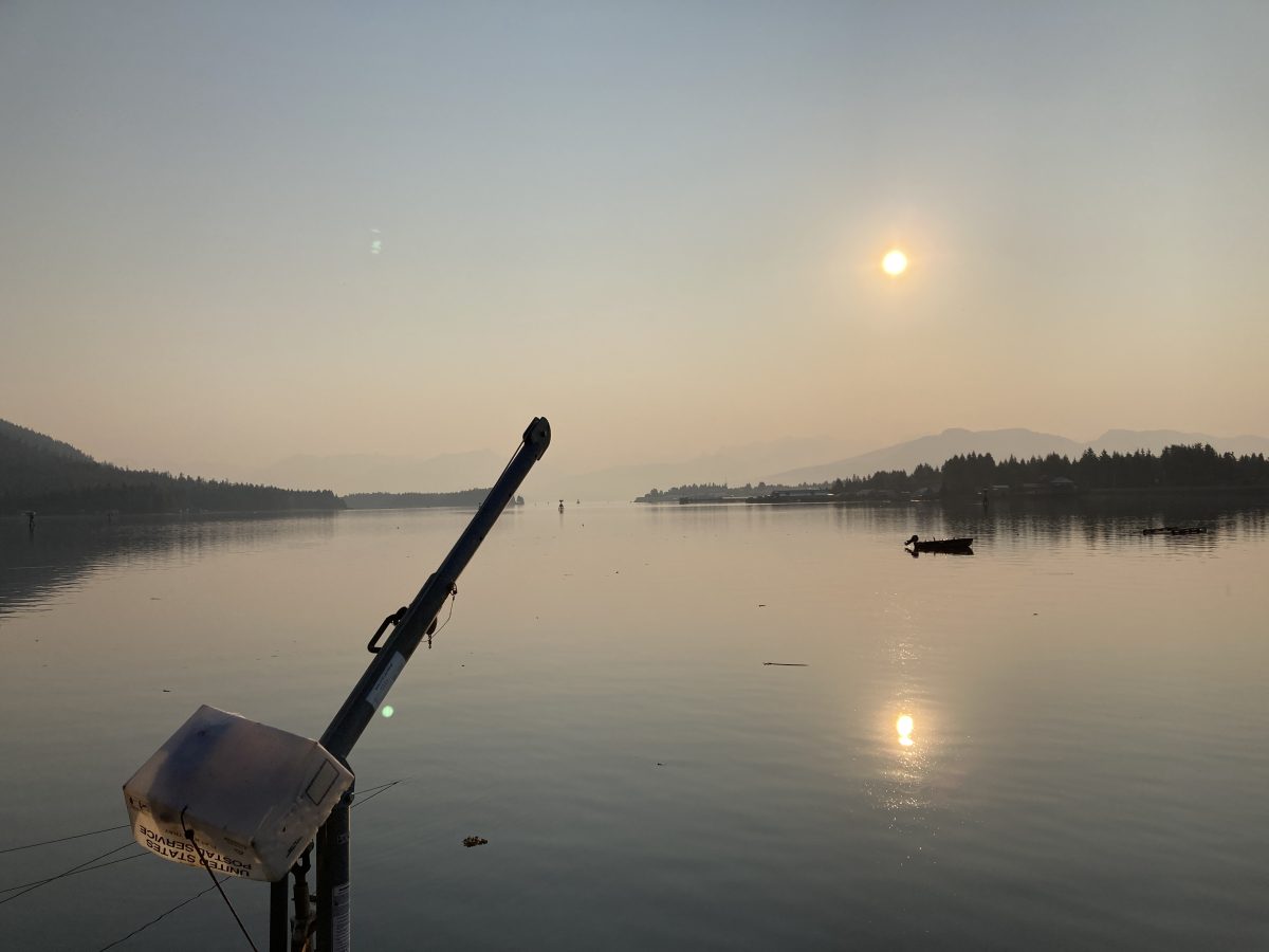 Petersburg through the haze one mile distant. Devil’s Thumb and the Stikine Icefields are hidden. This photo was taken early in the morning–the sun rises directly over Devil’s Thumb just after 3am, even when you can’t see it. Sunset is around 9:30pm so that makes for a long day at the summer solstice–nights are never dark.