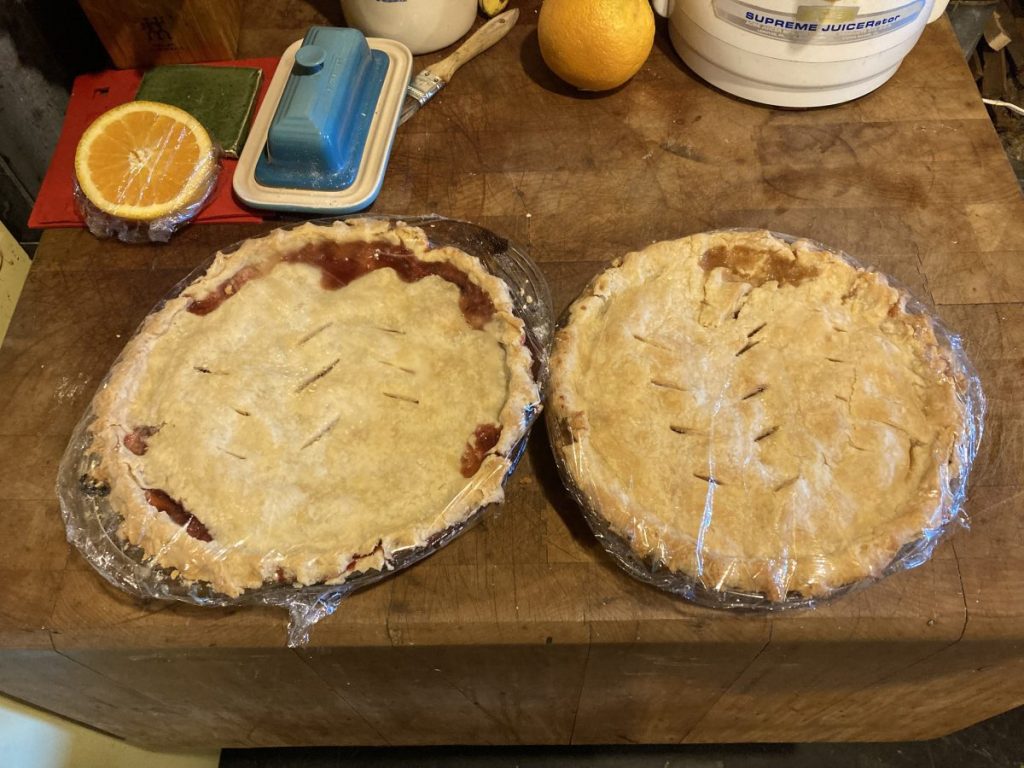 I would be remiss if I didn’t mention the pies I made–nothing finer for breakfast with a cup of coffee. I only made four this short summer–one rhubarb from my front yard and a peach pie–surprisingly good peaches this year at our local grocery.
