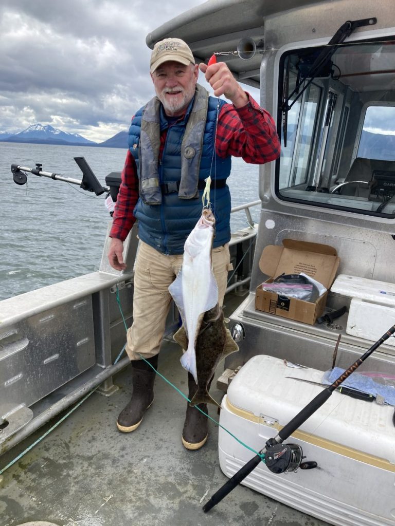 The first order of business this summer is to go fishing. I first invite a friend who knows where the fish are and we catch about 15 halibut–all small ones–but we toss some back. Halibut are getting smaller–if you want the big ones (40#), you need to drive about 50 miles each way–and then it becomes cost effective to simply buy it from our local fish processor. These are two Pacific Cod and below them, two halibut caught in one pull: