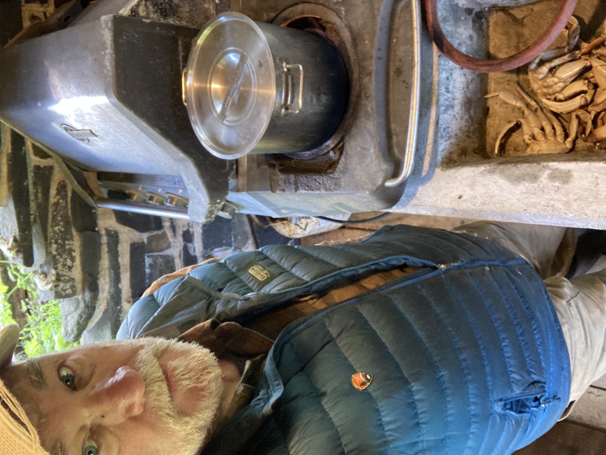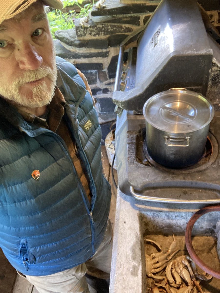 You have to cook crab outdoors. The master chef of the Yacht Club in action.
