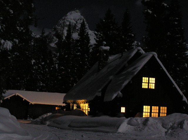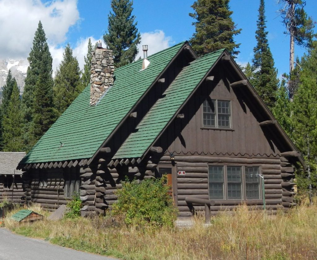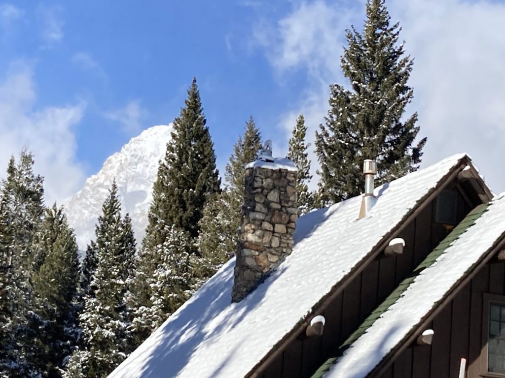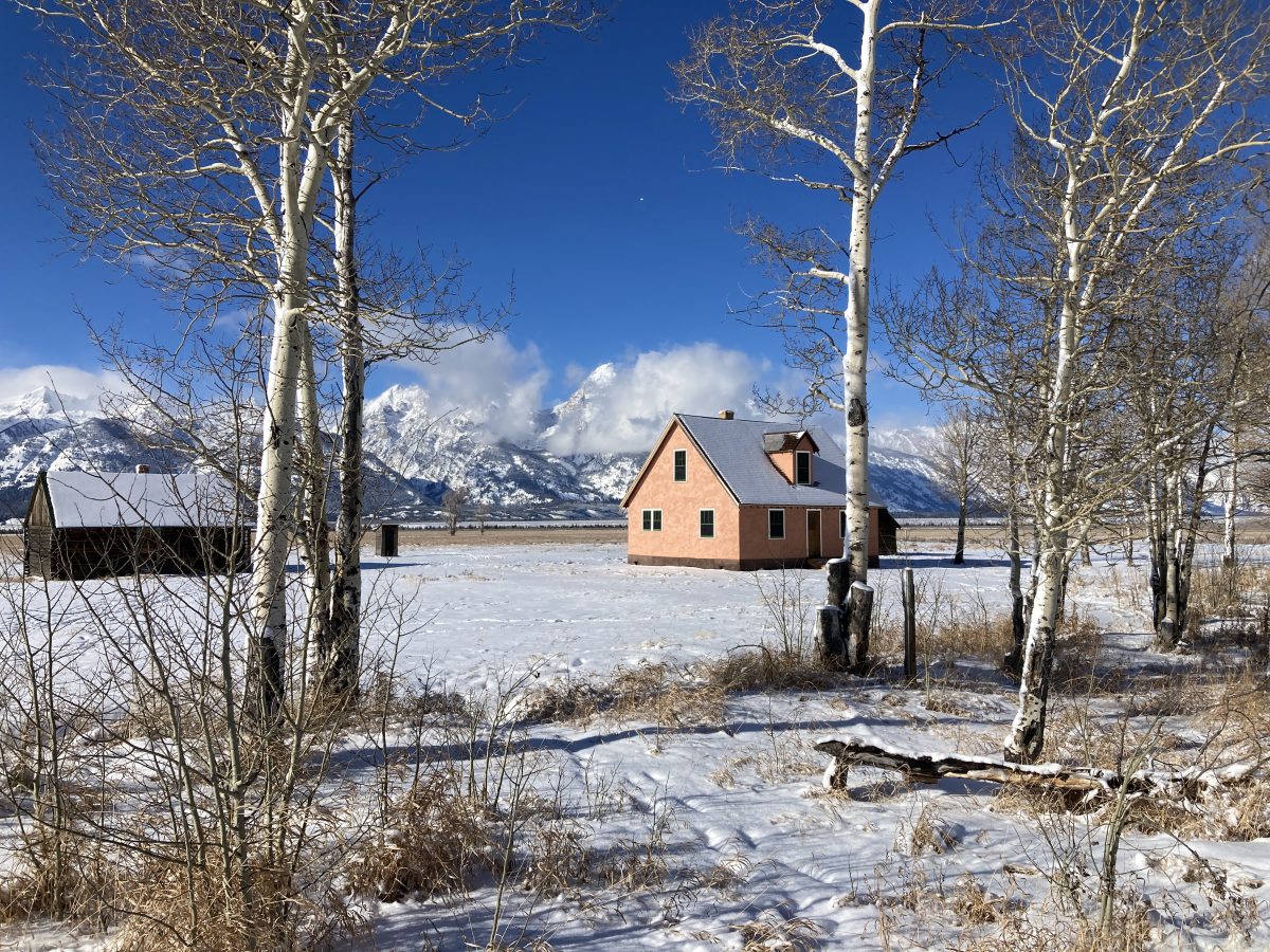 My old digs–Beaver Creek cabin #8 with the Grand Teton towering above and right, John Molton’s home which is one of the last standing home on Mormon Row.