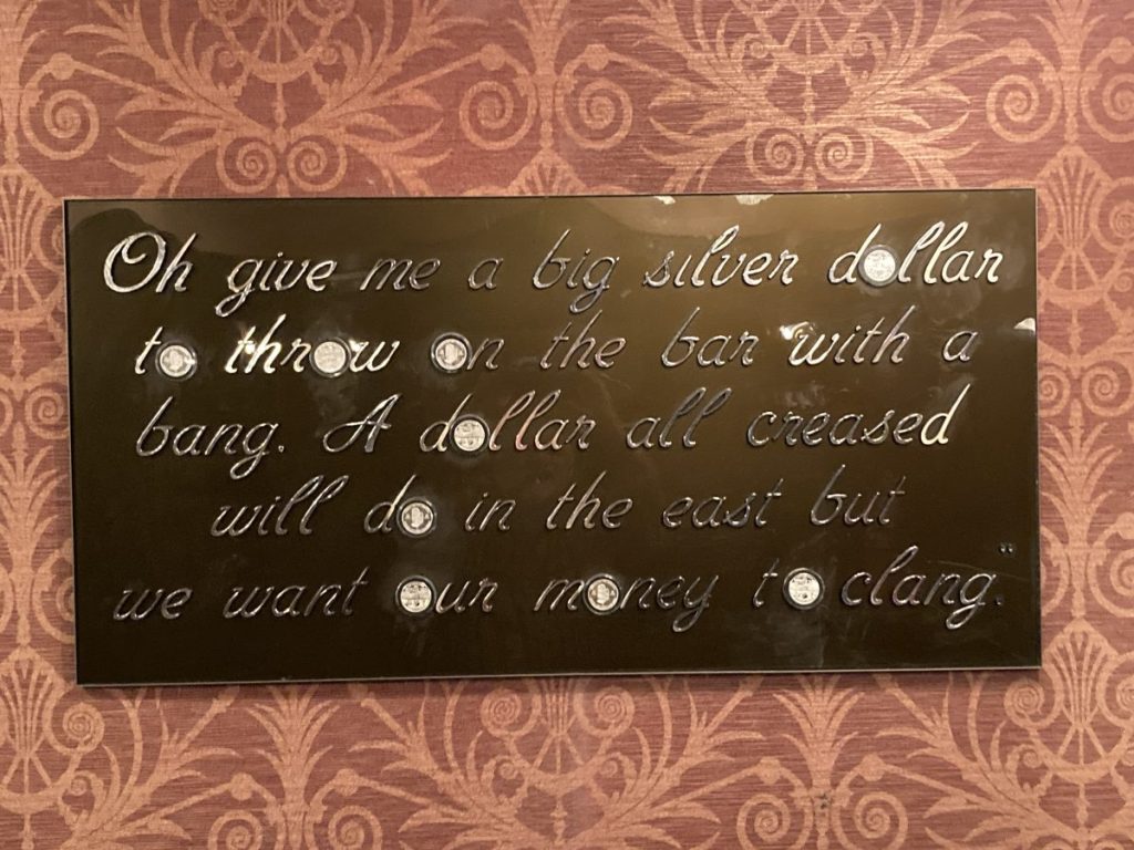 And above the bar is this plaque–written by the WPA–Federal Writer’s Project (April 1940. No kidding!) Paper money was issued in lieu of an actual silver dollar beginning in about 1933 and the real stuff (silver) was banked in US Treasury vaults until the Nixon era when it was uncoupled entirely. I won’t expound too much on the economics of currency exchange–since I know practically nothing about it–but suffice it to say that Nevadans were pissed-off and commissioned this poem from WPA hired poets. The politics of Nevadans has changed considerably since.