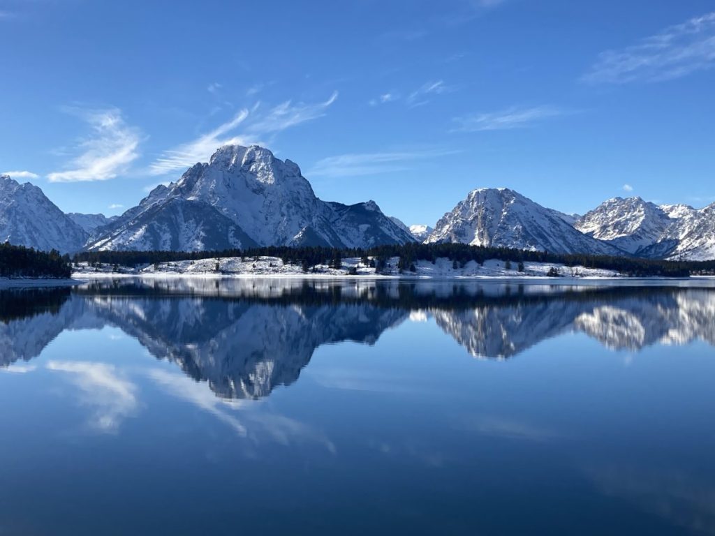Driving south as far as Signal Mountain Campground just for kicks–I pass Catholic Bay and this majestic view of Mt. Moran, which dominates the north end of the range.
