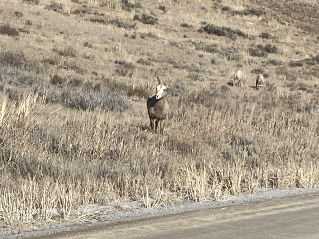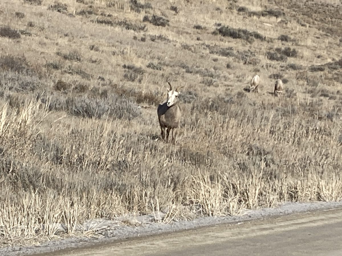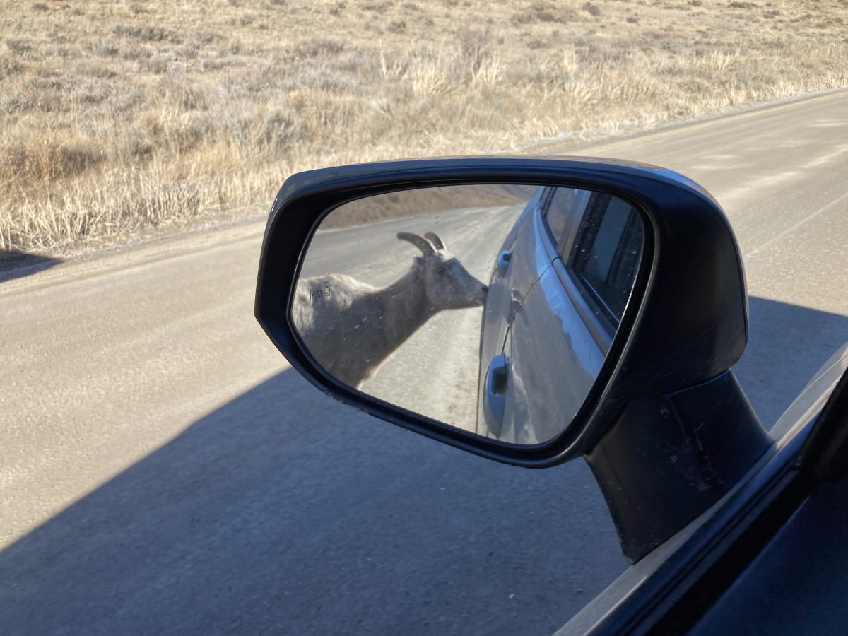 On the Miller Butte/Curtis Canyon road, a Rocky Mountain sheep finds my new Toyota interesting and walk slowly over to me. Quite puzzling until…..