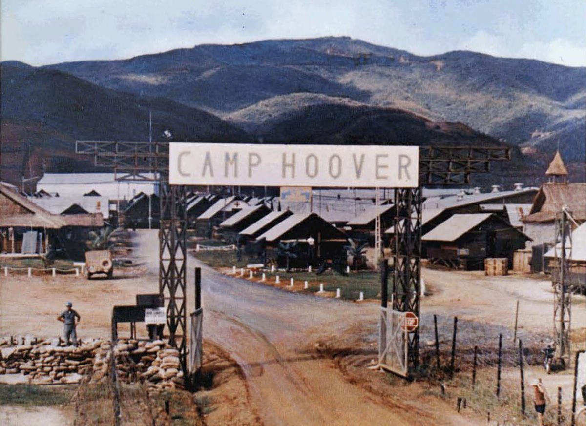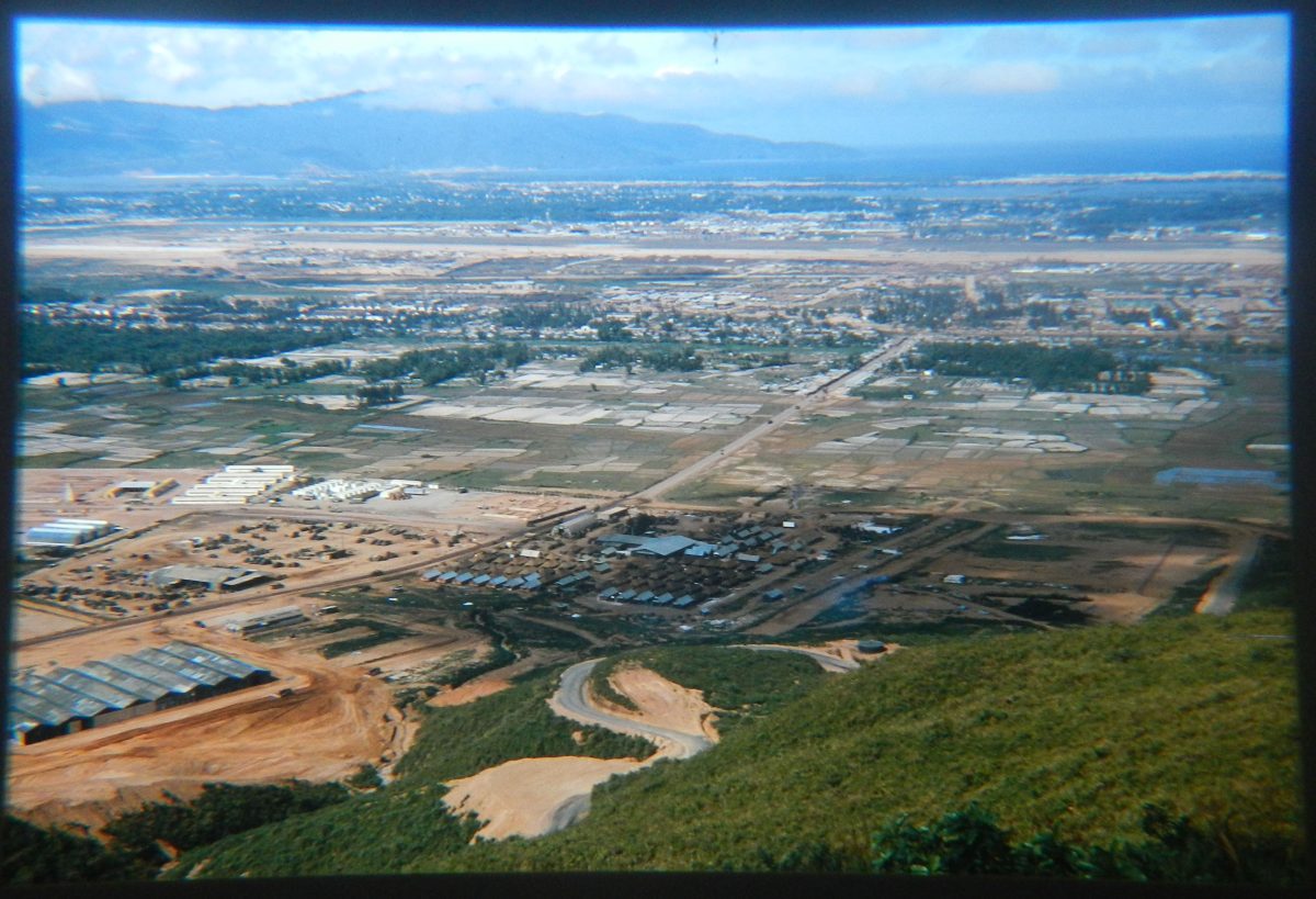 Here is a photo I took from near the top of Hill 327 in 1966. This is the DaNang airport–the one I jumped the fence on and crossed the center six months earlier. Due east of the airport was a small village we nicknamed “Dogpatch–in the center of the photo at the crossroads–after Lil Abner’s hometown in the Sunday comics. At the foot of Hill 327 where I took this photo is our base, Camp Hoover.