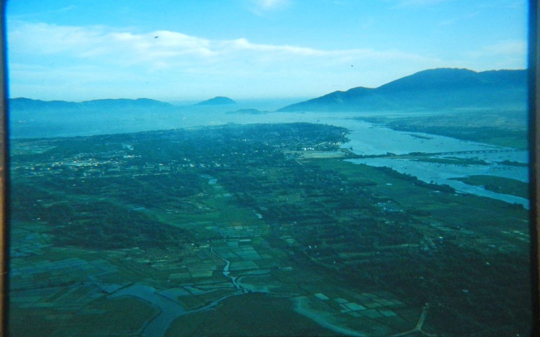 After four months back in Port Hueneme training and taking deserved leave, and having climbed a few mountains, I climbed back aboard a C-141 Starlifter once again. I would spend another 6 more months with the Navy Seabees’ MCB-10 up against Hill 327 shown in the foreground below. Just prior to landing, the captain informed us that we would make a “combat approach” or a very steep descent. Bracing for the worst, a good half hour went by without any detected motion–in fact, I thought I could have already landed. Then a huge smack and roar of engines and we had arrived. Upon departing the aircraft, the first thing I was greeted with was the familiar smell of tropical heat, wet bamboo and open sewers. Welcome to Vietnam again. The top photo was taken from the cockpit of a C-130 on my R&R to Bangkok on the first deployment to Chu Lai. There are now three more bridges north of the one here on the right. Note the rice paddies adjacent to town.