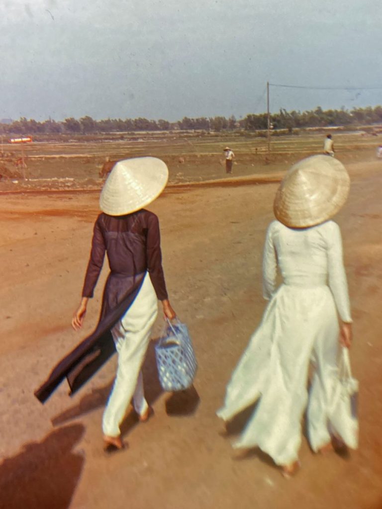 The traditional dress of young Vietnamese women–the Ao Dai (the “D” is pronounced almost like a “Y”)–on a walk to Dogpatch. I spend weeks in these rice paddies–but not picking or planting rice–here’s the story: