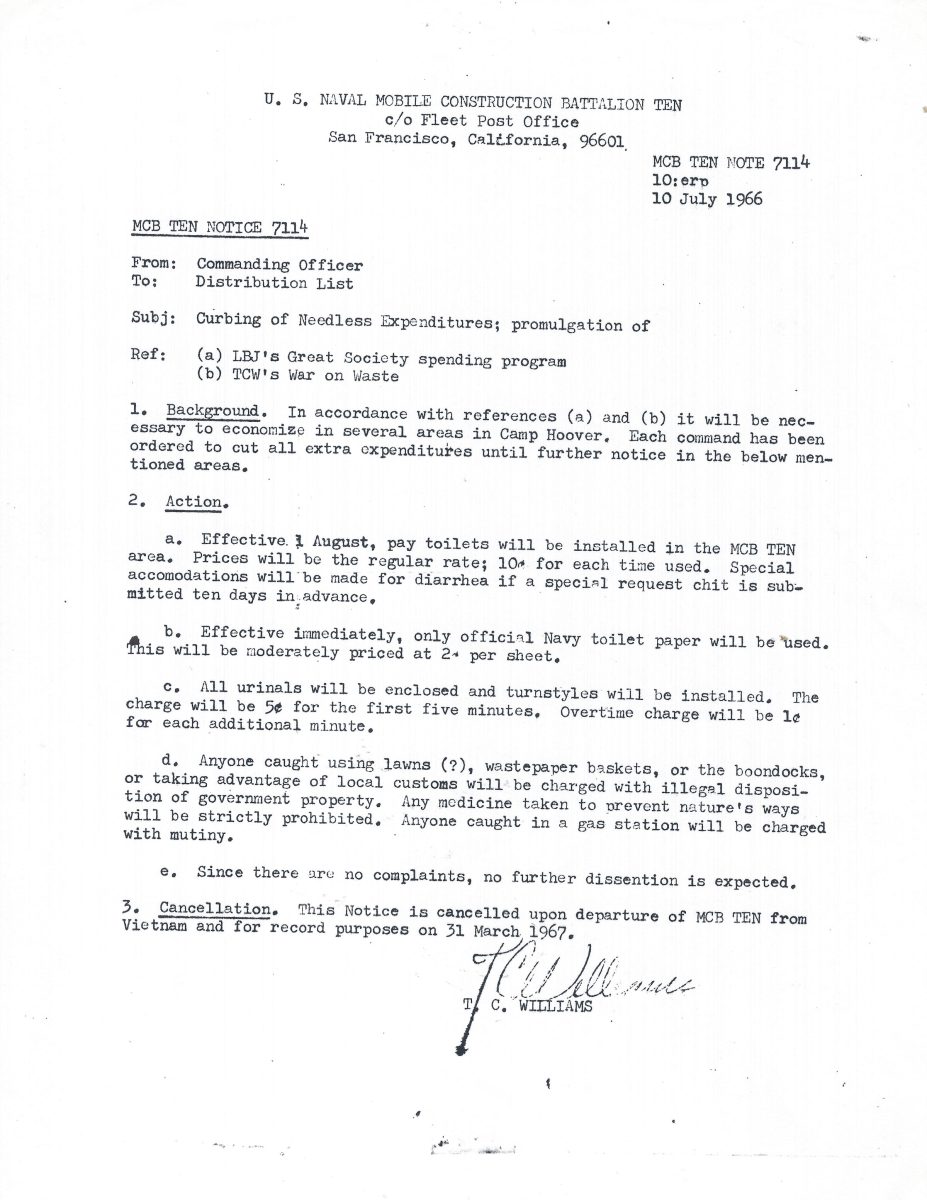 Our skipper, who will be identified in a bit, always wanted to be an Admiral. Now, there’s an old saying that there are no “Peacetime Admirals.” That all advancement to this prestigious rank occur in wartime–and Vietnam was, for all intents and purposes, a war. With his eye on this prize, the skipper recruited all of the elite Seabees in his command that could further this purpose…..including me. He called me into his office one day and ordered me to retype all the BuPers (Bureau of Personnel) Manuals–that is all “Notices” and “Memorandums” pursuant to our conduct on the base. And I had to do this on my spare time. That’s the reward I get for wielding my Remington Automatic (typrwriter, that is) in such a proficient manner…… Night after night, I’d sit in my office and buff out the paperwork so the skipper could get his golden cuffs. I could hear the men down at the enlisted men’s club cheering on sand-crab races and the like……click, clap, click, clap…… One night I was retyping this rather lengthy (and quite useless) Memorandum–a full 6 pages, no less!–on “Duties and Responsibilities of the Vegetable Preparation Man.” I’m not making this up. A six page treatice on how to peal g*ddamn potatoes! I was livid. But that’s not all…..he wanted in quadruplicate without any erasures–six pages! I struggled through this evening steaming mad but by the end of the night I came up with an even better one…… How to use the crappers. TCW–as our skipper was sometimes called–was always trying to pinch pennies, and at one time had us plant lawns, and if you recall Lyndon B. Johnson’s “War on Waste” program, you’ll get the idea. Well, I worked a bit overtime that night……and here was the brilliant result: